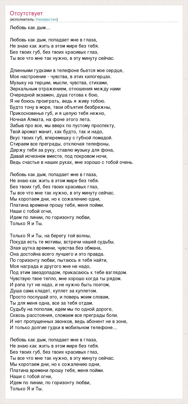 Любовь как дым… Любовь как дым, попадает мне в глаза, Не знаю как жить в этом мире без тебя. Без твоих губ, без твоих красивых глаз, Ты все что мне так нужно, в эту минуту сейчас. Длинными гудками в телефоне бьется мое сердце, Мое настроение - чувства, в этих килогерцах. Музыку на терции, мысли, чувства, стихами, Зеркальным отражением, отношения между нами Очередной экзамен, душа готова к бою, Я не боюсь проиграть, ведь я живу тобою. Будто тону в море, твои объятия безбрежны, Прикосновенье губ, и я целую тебя нежно, Ночная Алмата, на фоне этого лета. Забыв про все, мы вверх по пустому проспекту, Твой аромат манит, как будто, так и надо, Вкус твоих губ, вперемешку с губной помадой. Стираем все преграды, отключая телефоны, Держу тебя за руку, ставлю музыку для фона, Давай исчезнем вместе, под покровом ночи, Ведь счастье в наших руках, мне хорошо с тобой очень. Любовь как дым, попадает мне в глаза, Не знаю как жить в этом мире без тебя. Без твоих губ, без твоих красивых глаз, Ты все что мне так нужно, в эту минуту сейчас. Мы коротаем дни, но к сожалению одни, Платина времени прошу тебя, меня пойми. Наши с тобой огни, Идем по линии, по горизонту любви, Только Я и Ты. Только Я и Ты, на берегу той волны, Покуда есть те мотивы, встречи нашей судьбы. Злая шутка времени, чувства без обмана, Она достойна всего лучшего и это правда. По горизонту любви, пытаюсь я тебя найти, Моя награда и другого мне не надо, Под этим звездопадом, прикасаюсь к тебе взглядом. Чувствую твое тепло, мне хорошо когда ты рядом. И рэпа тут не надо, и не нужно быть поэтом, Душа сама кладет, куплет за куплетом. Просто послушай это, и поверь моим словам, Ты для меня одна, все за тебя отдам. Судьбу на пополам, идем мы по одной дороге, Сквозь расстояния, сломаем все преграды боли. И нет пропущенных звонков, ведь абонент не в зоне, И только долгие гудки в мобильном телефоне… Любовь как дым, попадает мне в глаза, Не знаю как жить в этом мире без тебя. Без твоих губ, без твоих красивых глаз, Ты все что мне так нужно, в эту минуту сейчас. Мы коротаем дни, но к сожалению одни, Платина времени прошу тебя, меня пойми. Наши с тобой огни, Идем по линии, по горизонту любви, Только Я и Ты.
