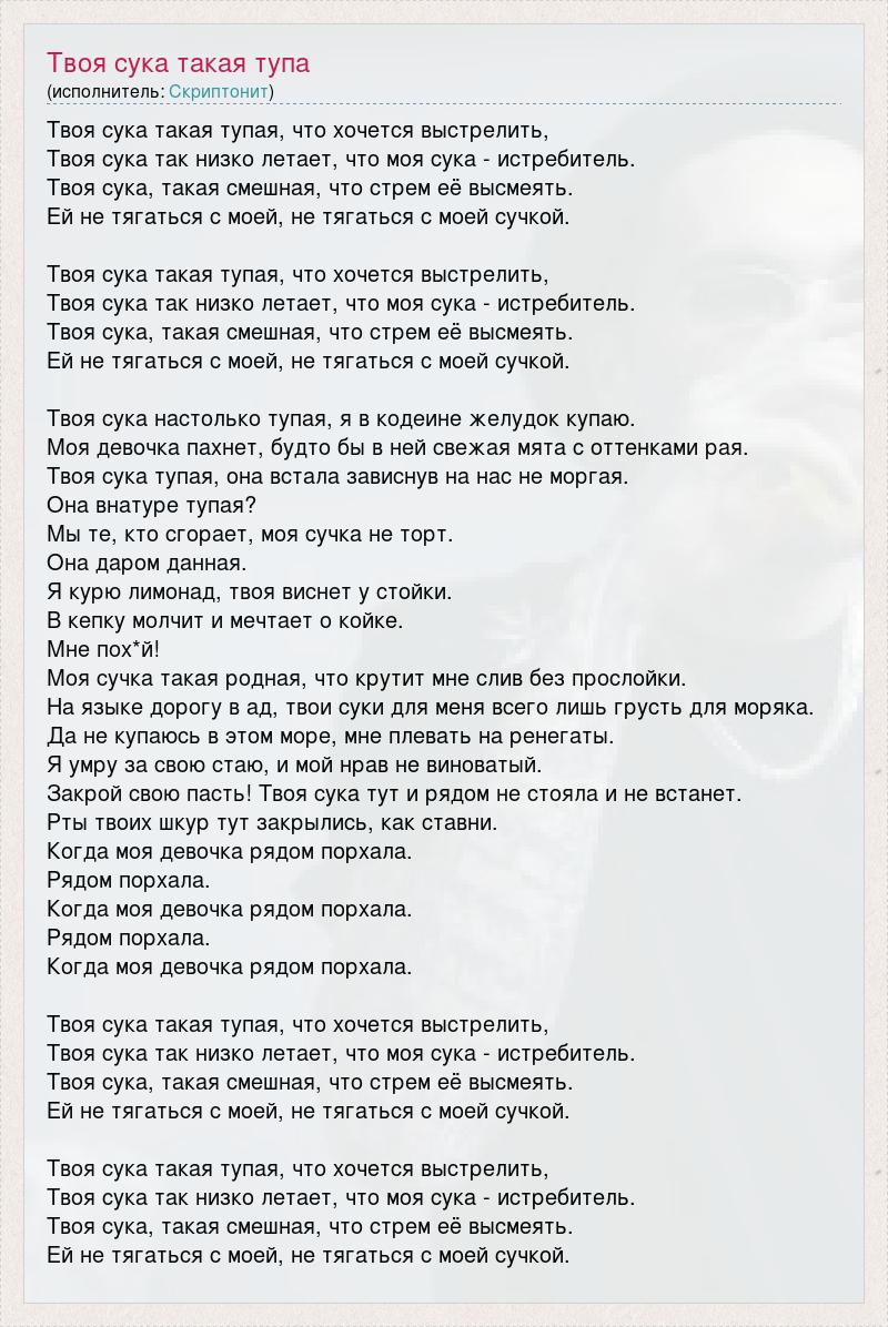 Твоя сука такая тупая, что хочется выстрелить, Твоя сука так низко летает, что моя сука - истребитель. Твоя сука, такая смешная, что стрем её высмеять. Ей не тягаться с моей, не тягаться с моей сучкой. Твоя сука такая тупая, что хочется выстрелить, Твоя сука так низко летает, что моя сука - истребитель. Твоя сука, такая смешная, что стрем её высмеять. Ей не тягаться с моей, не тягаться с моей сучкой. Твоя сука настолько тупая, я в кодеине желудок купаю. Моя девочка пахнет, будто бы в ней свежая мята с оттенками рая. Твоя сука тупая, она встала зависнув на нас не моргая. Она внатуре тупая? Мы те, кто сгорает, моя сучка не торт. Она даром данная. Я курю лимонад, твоя виснет у стойки. В кепку молчит и мечтает о койке. Мне пох*й! Моя сучка такая родная, что крутит мне слив без прослойки. На языке дорогу в ад, твои суки для меня всего лишь грусть для моряка. Да не купаюсь в этом море, мне плевать на ренегаты. Я умру за свою стаю, и мой нрав не виноватый. Закрой свою пасть! Твоя сука тут и рядом не стояла и не встанет. Рты твоих шкур тут закрылись, как ставни. Когда моя девочка рядом порхала. Рядом порхала. Когда моя девочка рядом порхала. Рядом порхала. Когда моя девочка рядом порхала. Твоя сука такая тупая, что хочется выстрелить, Твоя сука так низко летает, что моя сука - истребитель. Твоя сука, такая смешная, что стрем её высмеять. Ей не тягаться с моей, не тягаться с моей сучкой. Твоя сука такая тупая, что хочется выстрелить, Твоя сука так низко летает, что моя сука - истребитель. Твоя сука, такая смешная, что стрем её высмеять. Ей не тягаться с моей, не тягаться с моей сучкой.