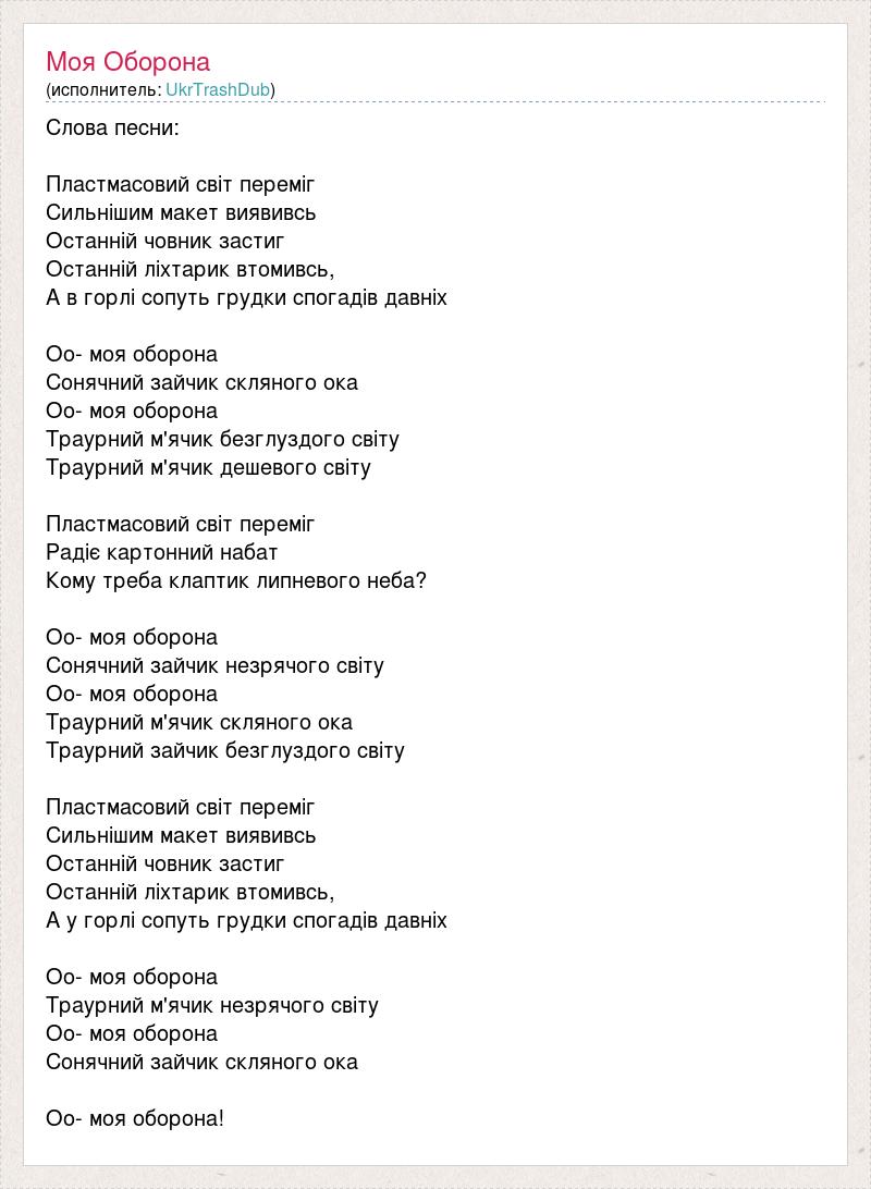 Слова песни: Пластмасовий світ переміг Сильнішим макет виявивсь Останній човник застиг Останній ліхтарик втомивсь, А в горлі сопуть грудки спогадів давніх Оо- моя оборона Сонячний зайчик скляного ока Оо- моя оборона Траурний м'ячик безглуздого світу Траурний м'ячик дешевого світу Пластмасовий світ переміг Радіє картонний набат Кому треба клаптик липневого неба? Оо- моя оборона Сонячний зайчик незрячого світу Оо- моя оборона Траурний м'ячик скляного ока Траурний зайчик безглуздого світу Пластмасовий світ переміг Сильнішим макет виявивсь Останній човник застиг Останній ліхтарик втомивсь, А у горлі сопуть грудки спогадів давніх Оо- моя оборона Траурний м'ячик незрячого світу Оо- моя оборона Сонячний зайчик скляного ока Оо- моя оборона!