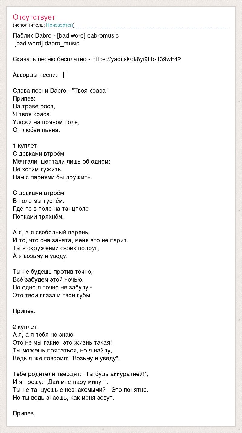 Паблик Dabro - [bad word] dabromusic [bad word] dabro_music Скачать песню бесплатно - https://yadi.sk/d/8yi9Lb-139wF42 Аккорды песни: | | | Слова песни Dabro - "Твоя краса" Припев: На траве роса, Я твоя краса. Уложи на пряном поле, От любви пьяна. 1 куплет: С девками втроём Мечтали, шептали лишь об одном: Не хотим тужить, Нам с парнями бы дружить. С девками втроём В поле мы туснём. Где-то в поле на танцполе Попками тряхнём. А я, а я свободный парень. И то, что она занята, меня это не парит. Ты в окружении своих подруг, А я возьму и уведу. Ты не будешь против точно, Всё забудем этой ночью. Но одно я точно не забуду - Это твои глаза и твои губы. Припев. 2 куплет: А я, а я тебя не знаю. Это не мы такие, это жизнь такая! Ты можешь прятаться, но я найду, Ведь я же говорил: "Возьму и уведу". Тебе родители твердят: "Ты будь аккуратней!", И я прошу: "Дай мне пару минут". Ты не танцуешь с незнакомыми? - Это понятно. Но ты ведь знаешь, как меня зовут. Припев.