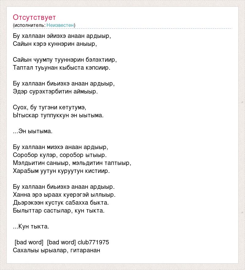 Бу халлаан эйиэхэ анаан ардыыр, Сайын кэрэ куннэрин аныыр, Сайын чуумпу тууннэрин бэлэхтиир, Таптал туьунан кыбыста кэпсиир. Бу халлаан биьиэхэ анаан ардыыр, Эдэр сурэхтэрбитин аймыыр. Суох, бу тугэни кетутумэ, Ытыскар туппуккун эн ыытыма. ...Эн ыытыма. Бу халлаан миэхэ анаан ардыыр, Соро5ор кулэр, соро5ор ытыыр. Мэлдьитин саныыр, мэльдитин таптыыр, Хара5ым уутун куруутун кистиир. Бу халлаан биьиэхэ анаан ардыыр. Ханна эрэ ыраах куерэгэй ыллыыр. Дьэрэкээн кустук са5ахха быкта. Былыттар састылар, кун тыкта. ...Кун тыкта. [bad word] [bad word] club771975 Сахалыы ырыалар, гитаранан