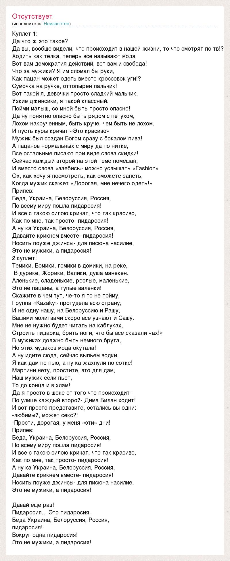Куплет 1: Да что ж это такое? Да вы, вообще видели, что происходит в нашей жизни, то что смотрят по тв!? Ходить как телка, теперь все называют мода Вот вам демократия действий, вот вам и свобода! Что за мужики? Я им сломал бы руки, Как пацан может одеть вместо кроссовок уги!? Сумочка на ручке, оттопырен пальчик! Вот такой я, девочки просто сладкий мальчик. Узкие джинсики, я такой классный. Пойми малыш, со мной быть просто опасно! Да ну понятно опасно быть рядом с петухом, Лохом накрученным, быть круче, чем быть не лохом. И пусть куры кричат «Это красиво» Мужик был создан Богом сразу с бокалом пива! А пацанов нормальных с миру да по нитке, Все остальные писают при виде слова скидки! Сейчас каждый второй на этой теме помешан, И вместо слова «заебись» можно услышать «Fashion» Ох, как хочу я посмотреть, как сможете запеть, Когда мужик скажет «Дорогая, мне нечего одеть!» Припев: Беда, Украина, Белоруссия, Россия, По всему миру пошла пидаросия! И все с такою силою кричат, что так красиво, Как по мне, так просто- пидаросия! А ну ка Украина, Белоруссия, Россия, Давайте крикнем вместе- пидаросия! Носить поуже джинсы- для писюна насилие, Это не мужики, а пидаросия! 2 куплет: Темики, Бомики, гомики в домики, на реке, В дурике, Жорики, Валики, душа манекен. Аленькие, сладенькие, рослые, маленькие, Это не пацаны, а тупые валенки! Скажите в чем тут, че-то я то не пойму, Группа «Kаzaky» прогудела всю страну, И не одну нашу, на Белоруссию и Рашу, Вашими молитвами скоро все узнают и Сашу. Мне не нужно будет читать на каблуках, Строить пидарка, брить ноги, что бы все сказали «ах!» В мужиках должно быть немного брута, Но этих мудаков мода окутала! А ну идите сюда, сейчас выпьем водки, Я как дам не пью, а ну ка жахнули по сотке! Мартини нету, простите, это для дам, Наш мужик если пьет, То до конца и в хлам! Да я просто в шоке от того что происходит- По улице каждый второй- Дима Билан ходит! И вот просто представите, остались вы одни: -любимый, может секс?! -Прости, дорогая, у меня «эти» дни! Припев: Беда, Украина, Белоруссия, Россия, По всему миру пошла пидаросия! И все с такою силою кричат, что так красиво, Как по мне, так просто- пидаросия! А ну ка Украина, Белоруссия, Россия, Давайте крикнем вместе- пидаросия! Носить поуже джинсы- для писюна насилие, Это не мужики, а пидаросия! Давай еще раз! Пидаросия.. Это пидаросия. Беда Украина, Белоруссия, Россия, пидаросия! Вокруг одна пидаросия! Это не мужики, а пидаросия!