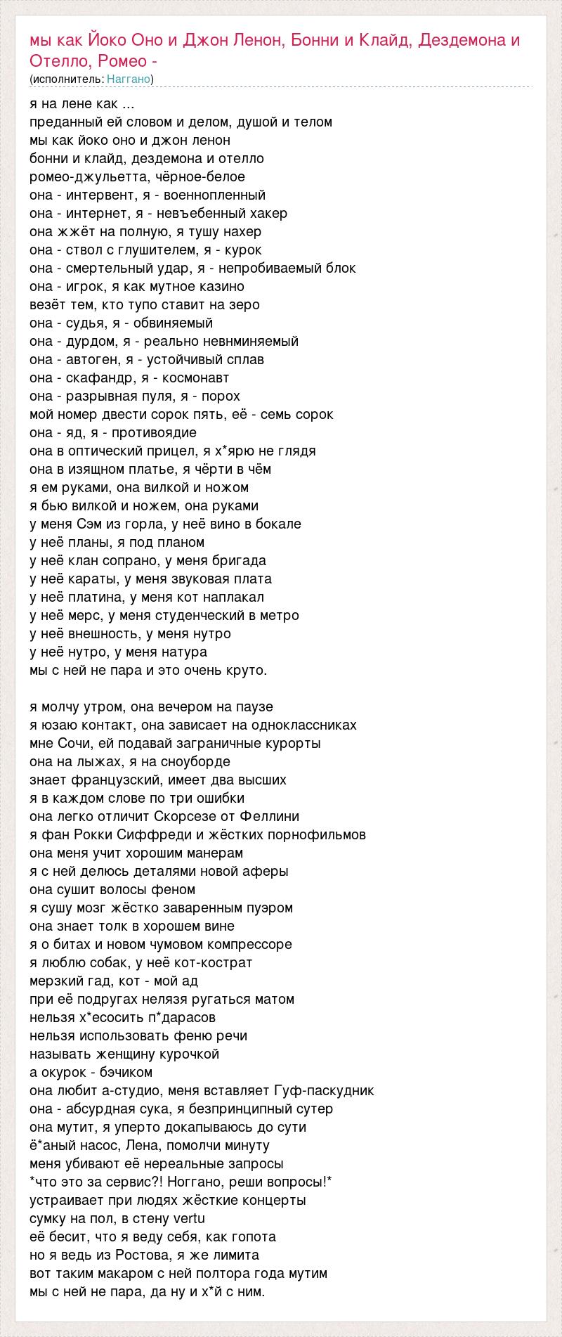 я на лене как ... преданный ей словом и делом, душой и телом мы как йоко оно и джон ленон бонни и клайд, дездемона и отелло ромео-джульетта, чёрное-белое она - интервент, я - военнопленный она - интернет, я - невъебенный хакер она жжёт на полную, я тушу нахер она - ствол с глушителем, я - курок она - смертельный удар, я - непробиваемый блок она - игрок, я как мутное казино везёт тем, кто тупо ставит на зеро она - судья, я - обвиняемый она - дурдом, я - реально невнминяемый она - автоген, я - устойчивый сплав она - скафандр, я - космонавт она - разрывная пуля, я - порох мой номер двести сорок пять, её - семь сорок она - яд, я - противоядие она в оптический прицел, я х*ярю не глядя она в изящном платье, я чёрти в чём я ем руками, она вилкой и ножом я бью вилкой и ножем, она руками у меня Сэм из горла, у неё вино в бокале у неё планы, я под планом у неё клан сопрано, у меня бригада у неё караты, у меня звуковая плата у неё платина, у меня кот наплакал у неё мерс, у меня студенческий в метро у неё внешность, у меня нутро у неё нутро, у меня натура мы с ней не пара и это очень круто. я молчу утром, она вечером на паузе я юзаю контакт, она зависает на одноклассниках мне Сочи, ей подавай заграничные курорты она на лыжах, я на сноуборде знает французский, имеет два высших я в каждом слове по три ошибки она легко отличит Скорсезе от Феллини я фан Рокки Сиффреди и жёстких порнофильмов она меня учит хорошим манерам я с ней делюсь деталями новой аферы она сушит волосы феном я сушу мозг жёстко заваренным пуэром она знает толк в хорошем вине я о битах и новом чумовом компрессоре я люблю собак, у неё кот-кострат мерзкий гад, кот - мой ад при её подругах нелязя ругаться матом нельзя х*есосить п*дарасов нельзя использовать феню речи называть женщину курочкой а окурок - бэчиком она любит а-студио, меня вставляет Гуф-паскудник она - абсурдная сука, я безпринципный сутер она мутит, я уперто докапываюсь до сути ё*аный насос, Лена, помолчи минуту меня убивают её нереальные запросы *что это за сервис?! Ноггано, реши вопросы!* устраивает при людях жёсткие концерты сумку на пол, в стену vertu её бесит, что я веду себя, как гопота но я ведь из Ростова, я же лимита вот таким макаром с ней полтора года мутим мы с ней не пара, да ну и х*й с ним.