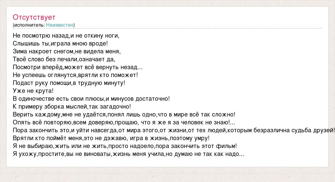 Не посмотрю назад,и не откину ноги, Слышишь ты,играла мною вроде! Зима накроет снегом,не видела меня, Твоё слово без печали,означает да, Посмотри вперёд,может всё вернуть незад... Не успеешь оглянутся,врятли кто поможет! Подаст руку помощи,в трудную минуту! Уже не крута! В одиночестве есть свои плюсы,и минусов достаточно! К примеру зборка мыслей,так загадочно! Верить каждому,мне не удаётся,понял лишь одно,что в мире всё так сложно! Опять всё повторяю,всем доверяю,прощаю, что я же я за человек не знаю!... Пора закончить это,и уйти навсегда,от мира этого,от жизни,от тех людей,которым безразлична судьба друзей! Врятли кто поймёт меня,это не дэжавю, игра в жизнь,поэтому умру! Я не выбираю,жить или не жить,просто надоело,пора закончить этот фильм! Я ухожу,простите,вы не виноваты,жизнь меня учила,но думаю не так как надо...