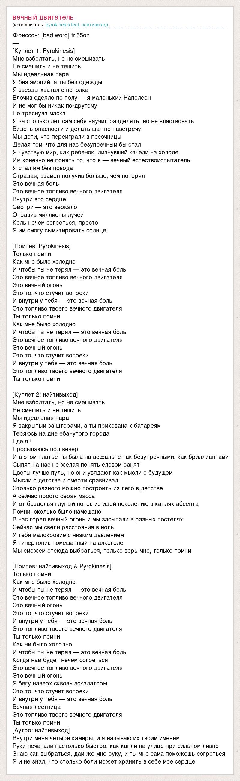 Фриссон: [bad word] fri55on — [Куплет 1: Pyrokinesis] Мне взболтать, но не смешивать Не смешить и не тешить Мы идеальная пара Я без эмоций, а ты без одежды Я звезды хватал с потолка Влочив одеяло по полу — я маленький Наполеон И не мог бы никак по-другому Но треснула маска Я за столько лет сам себя научил разделять, но не властвовать Видеть опасности и делать шаг не навстречу Мы дети, что переиграли в песочницы Делая том, что для нас безупречным бы стал Я чувствую мир, как ребенок, лизнувший качели на холоде Им конечно не понять то, что я — вечный естествоиспытатель Я стал им без повода Страдая, взамен получив больше, чем потерял Это вечная боль Это вечное топливо вечного двигателя Внутри это сердце Смотри — это зеркало Отразив миллионы лучей Коль нечем согреться, просто Я им смогу сымитировать солнце [Припев: Pyrokinesis] Только помни Как мне было холодно И чтобы ты не терял — это вечная боль Это вечное топливо вечного двигателя Это вечный огонь Это то, что стучит вопреки И внутри у тебя — это вечная боль Это топливо твоего вечного двигателя Ты только помни Как мне было холодно И чтобы ты не терял — это вечная боль Это вечное топливо вечного двигателя Это вечный огонь Это то, что стучит вопреки И внутри у тебя — это вечная боль Это топливо твоего вечного двигателя Ты только помни [Куплет 2: найтивыход] Мне взболтать, но не смешивать Не смешить и не тешить Мы идеальная пара Я закрытый за шторами, а ты прикована к батареям Теряюсь на дне ебанутого города Где я? Просыпаюсь под вечер И в этом платье ты была на асфальте так безупречными, как бриллиантами Сыпят на нас не желая понять словом ранят Цветы лучше пуль, но они увядают как мысли о будущем Мысли о детстве и смерти сравнивал Столько разного можно построить из лего в детстве А сейчас просто серая масса И от безделья глупый поток из идей поколению в каплях абсента Помни, сколько было намешано В нас горел вечный огонь и мы засыпали в разных постелях Сейчас мы свели расстояния в ноль У тебя малокровие с низким давлением Я гипертоник помешанный на алкоголе Мы сможем отсюда выбраться, только верь мне, только помни [Припев: найтивыход & Pyrokinesis] Только помни Как мне было холодно И чтобы ты не терял — это вечная боль Это вечное топливо вечного двигателя Это вечный огонь Это то, что стучит вопреки И внутри у тебя — это вечная боль Это топливо твоего вечного двигателя Ты только помни Как ни было холодно И чтобы ты не терял — это вечная боль Когда нам будет нечем согреться Это вечное топливо вечного двигателя Это вечный огонь Я бегу наверх сквозь эскалаторы Это то, что стучит вопреки И внутри у тебя — это вечная боль Вечная лестница Это топливо твоего вечного двигателя Ты только помни [Аутро: найтивыход] Внутри меня четыре камеры, и я называю их твоим именем Руки печатали настолько быстро, как капли на улице при сильном ливне Знаю как выбраться, дай же мне руку, и ты мне сама поможешь согреться Я и не знал, что столько боли может хранить в себе мое сердце