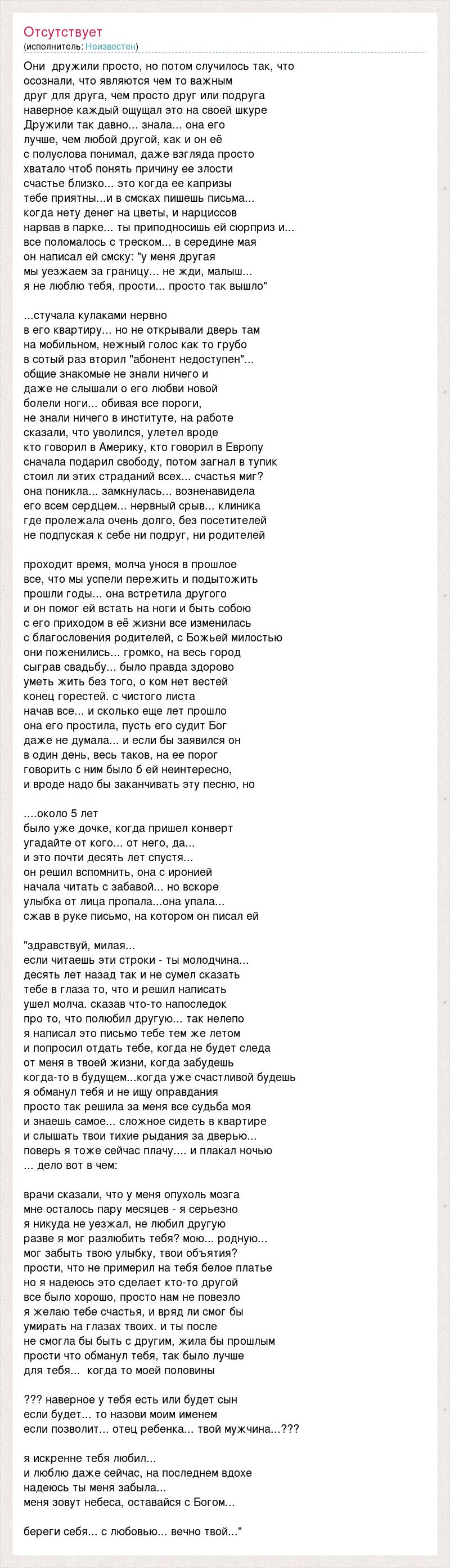 Они дружили просто, но потом случилось так, что осознали, что являются чем то важным друг для друга, чем просто друг или подруга наверное каждый ощущал это на своей шкуре Дружили так давно... знала... она его лучше, чем любой другой, как и он её с полуслова понимал, даже взгляда просто хватало чтоб понять причину ее злости счастье близко... это когда ее капризы тебе приятны...и в смсках пишешь письма... когда нету денег на цветы, и нарциссов нарвав в парке... ты приподносишь ей сюрприз и... все поломалось с треском... в середине мая он написал ей смску: "у меня другая мы уезжаем за границу... не жди, малыш... я не люблю тебя, прости... просто так вышло" ...стучала кулаками нервно в его квартиру... но не открывали дверь там на мобильном, нежный голос как то грубо в сотый раз вторил "абонент недоступен"... общие знакомые не знали ничего и даже не слышали о его любви новой болели ноги... обивая все пороги, не знали ничего в институте, на работе сказали, что уволился, улетел вроде кто говорил в Америку, кто говорил в Европу сначала подарил свободу, потом загнал в тупик стоил ли этих страданий всех... счастья миг? она поникла... замкнулась... возненавидела его всем сердцем... нервный срыв... клиника где пролежала очень долго, без посетителей не подпуская к себе ни подруг, ни родителей проходит время, молча унося в прошлое все, что мы успели пережить и подытожить прошли годы... она встретила другого и он помог ей встать на ноги и быть собою с его приходом в её жизни все изменилась с благословения родителей, с Божьей милостью они поженились... громко, на весь город сыграв свадьбу... было правда здорово уметь жить без того, о ком нет вестей конец горестей. с чистого листа начав все... и сколько еще лет прошло она его простила, пусть его судит Бог даже не думала... и если бы заявился он в один день, весь таков, на ее порог говорить с ним было б ей неинтересно, и вроде надо бы заканчивать эту песню, но ....около 5 лет было уже дочке, когда пришел конверт угадайте от кого... от него, да... и это почти десять лет спустя... он решил вспомнить, она с иронией начала читать с забавой... но вскоре улыбка от лица пропала...она упала... сжав в руке письмо, на котором он писал ей "здравствуй, милая... если читаешь эти строки - ты молодчина... десять лет назад так и не сумел сказать тебе в глаза то, что и решил написать ушел молча. сказав что-то напоследок про то, что полюбил другую... так нелепо я написал это письмо тебе тем же летом и попросил отдать тебе, когда не будет следа от меня в твоей жизни, когда забудешь когда-то в будущем...когда уже счастливой будешь я обманул тебя и не ищу оправдания просто так решила за меня все судьба моя и знаешь самое... сложное сидеть в квартире и слышать твои тихие рыдания за дверью... поверь я тоже сейчас плачу.... и плакал ночью ... дело вот в чем: врачи сказали, что у меня опухоль мозга мне осталось пару месяцев - я серьезно я никуда не уезжал, не любил другую разве я мог разлюбить тебя? мою... родную... мог забыть твою улыбку, твои объятия? прости, что не примерил на тебя белое платье но я надеюсь это сделает кто-то другой все было хорошо, просто нам не повезло я желаю тебе счастья, и вряд ли смог бы умирать на глазах твоих. и ты после не смогла бы быть с другим, жила бы прошлым прости что обманул тебя, так было лучше для тебя... когда то моей половины ??? наверное у тебя есть или будет сын если будет... то на