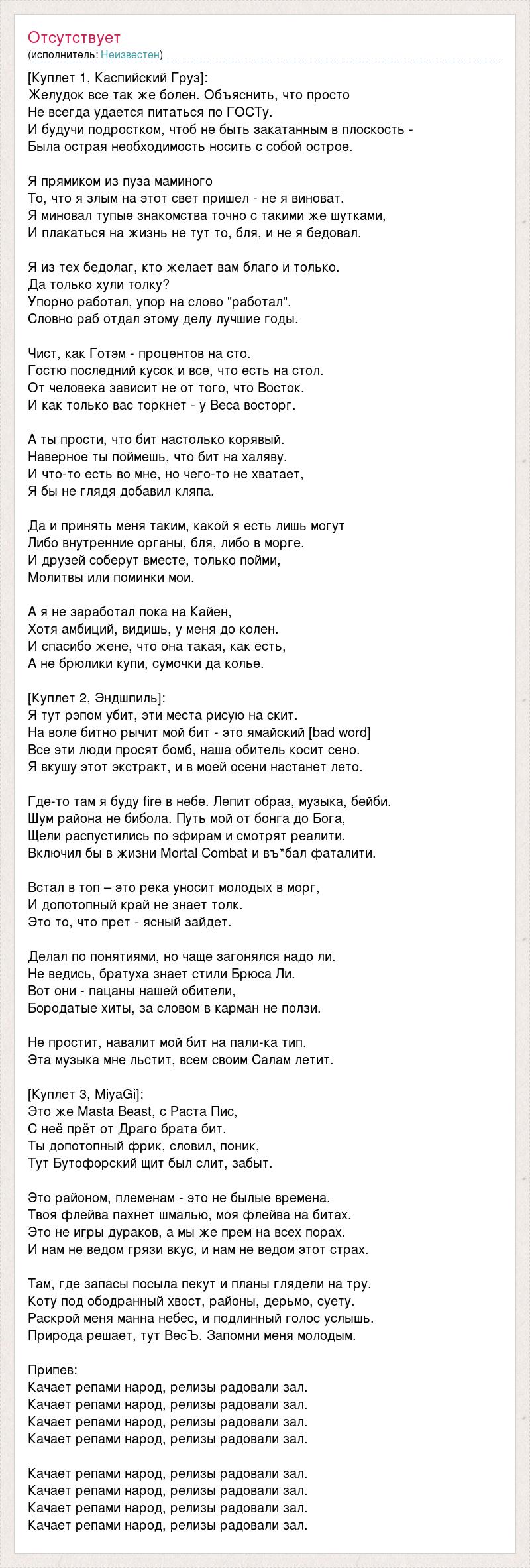 [Куплет 1, Каспийский Груз]: Желудок все так же болен. Объяснить, что просто Не всегда удается питаться по ГОСТу. И будучи подростком, чтоб не быть закатанным в плоскость - Была острая необходимость носить с собой острое. Я прямиком из пуза маминого То, что я злым на этот свет пришел - не я виноват. Я миновал тупые знакомства точно с такими же шутками, И плакаться на жизнь не тут то, бля, и не я бедовал. Я из тех бедолаг, кто желает вам благо и только. Да только хули толку? Упорно работал, упор на слово "работал". Словно раб отдал этому делу лучшие годы. Чист, как Готэм - процентов на сто. Гостю последний кусок и все, что есть на стол. От человека зависит не от того, что Восток. И как только вас торкнет - у Веса восторг. А ты прости, что бит настолько корявый. Наверное ты поймешь, что бит на халяву. И что-то есть во мне, но чего-то не хватает, Я бы не глядя добавил кляпа. Да и принять меня таким, какой я есть лишь могут Либо внутренние органы, бля, либо в морге. И друзей соберут вместе, только пойми, Молитвы или поминки мои. А я не заработал пока на Кайен, Хотя амбиций, видишь, у меня до колен. И спасибо жене, что она такая, как есть, А не брюлики купи, сумочки да колье. [Куплет 2, Эндшпиль]: Я тут рэпом убит, эти места рисую на скит. На воле битно рычит мой бит - это ямайский [bad word] Все эти люди просят бомб, наша обитель косит сено. Я вкушу этот экстракт, и в моей осени настанет лето. Где-то там я буду fire в небе. Лепит образ, музыка, бейби. Шум района не бибола. Путь мой от бонга до Бога, Щели распустились по эфирам и смотрят реалити. Включил бы в жизни Mortal Combat и въ*бал фаталити. Встал в топ – это река уносит молодых в морг, И допотопный край не знает толк. Это то, что прет - ясный зайдет. Делал по понятиями, но чаще загонялся надо ли. Не ведись, братуха знает стили Брюса Ли. Вот они - пацаны нашей обители, Бородатые хиты, за словом в карман не ползи. Не простит, навалит мой бит на пали-ка тип. Эта музыка мне льстит, всем своим Салам летит. [Куплет 3, MiyaGi]: Это же Masta Beast, с Раста Пис, С неё прёт от Драго брата бит. Ты допотопный фрик, словил, поник, Тут Бутофорский щит был слит, забыт. Это районом, племенам - это не былые времена. Твоя флейва пахнет шмалью, моя флейва на битах. Это не игры дураков, а мы же прем на всех порах. И нам не ведом грязи вкус, и нам не ведом этот страх. Там, где запасы посыла пекут и планы глядели на тру. Коту под ободранный хвост, районы, дерьмо, суету. Раскрой меня манна небес, и подлинный голос услышь. Природа решает, тут ВесЪ. Запомни меня молодым. Припев: Качает репами народ, релизы радовали зал. Качает репами народ, релизы радовали зал. Качает репами народ, релизы радовали зал. Качает репами народ, релизы радовали зал. Качает репами народ, релизы радовали зал. Качает репами народ, релизы радовали зал. Качает репами народ, релизы радовали зал. Качает репами народ, релизы радовали зал.