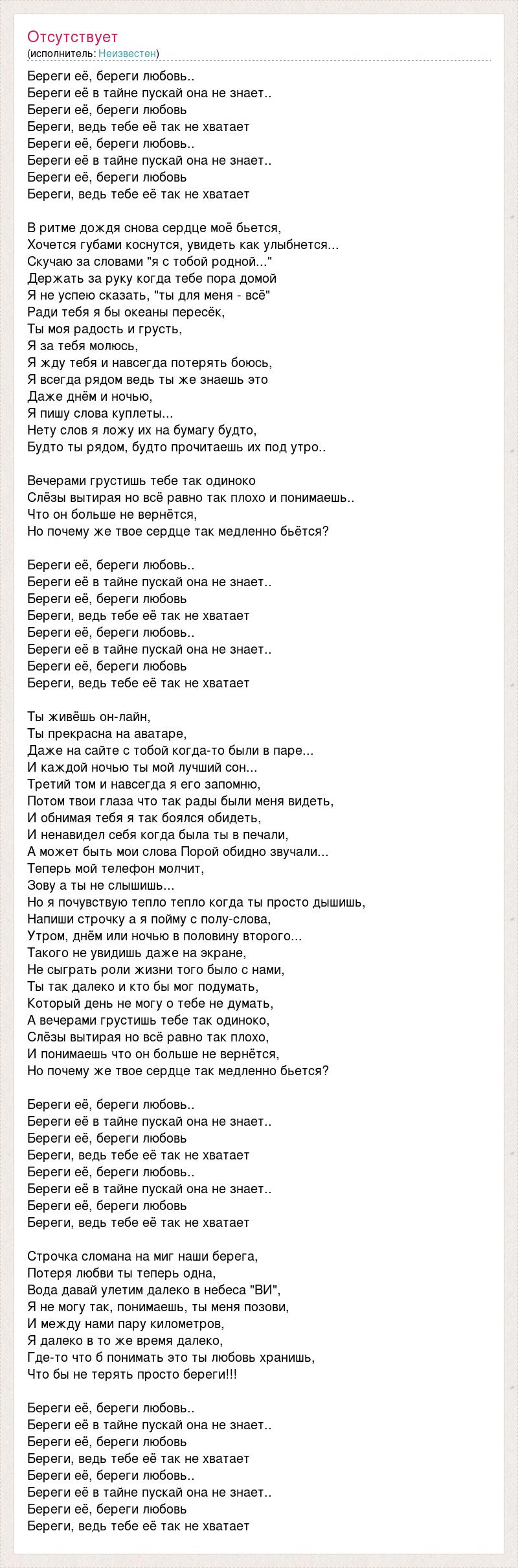 Береги её, береги любовь.. Береги её в тайне пускай она не знает.. Береги её, береги любовь Береги, ведь тебе её так не хватает Береги её, береги любовь.. Береги её в тайне пускай она не знает.. Береги её, береги любовь Береги, ведь тебе её так не хватает В ритме дождя снова сердце моё бьется, Хочется губами коснутся, увидеть как улыбнется... Скучаю за словами "я с тобой родной..." Держать за руку когда тебе пора домой Я не успею сказать, "ты для меня - всё" Ради тебя я бы океаны пересёк, Ты моя радость и грусть, Я за тебя молюсь, Я жду тебя и навсегда потерять боюсь, Я всегда рядом ведь ты же знаешь это Даже днём и ночью, Я пишу слова куплеты... Нету слов я ложу их на бумагу будто, Будто ты рядом, будто прочитаешь их под утро.. Вечерами грустишь тебе так одиноко Слёзы вытирая но всё равно так плохо и понимаешь.. Что он больше не вернётся, Но почему же твое сердце так медленно бьётся? Береги её, береги любовь.. Береги её в тайне пускай она не знает.. Береги её, береги любовь Береги, ведь тебе её так не хватает Береги её, береги любовь.. Береги её в тайне пускай она не знает.. Береги её, береги любовь Береги, ведь тебе её так не хватает Ты живёшь он-лайн, Ты прекрасна на аватаре, Даже на сайте с тобой когда-то были в паре... И каждой ночью ты мой лучший сон... Третий том и навсегда я его запомню, Потом твои глаза что так рады были меня видеть, И обнимая тебя я так боялся обидеть, И ненавидел себя когда была ты в печали, А может быть мои слова Порой обидно звучали... Теперь мой телефон молчит, Зову а ты не слышишь... Но я почувствую тепло тепло когда ты просто дышишь, Напиши строчку а я пойму с полу-слова, Утром, днём или ночью в половину второго... Такого не увидишь даже на экране, Не сыграть роли жизни того было с нами, Ты так далеко и кто бы мог подумать, Который день не могу о тебе не думать, А вечерами грустишь тебе так одиноко, Слёзы вытирая но всё равно так плохо, И понимаешь что он больше не вернётся, Но почему же твое сердце так медленно бьется? Береги её, береги любовь.. Береги её в тайне пускай она не знает.. Береги её, береги любовь Береги, ведь тебе её так не хватает Береги её, береги любовь.. Береги её в тайне пускай она не знает.. Береги её, береги любовь Береги, ведь тебе её так не хватает Строчка сломана на миг наши берега, Потеря любви ты теперь одна, Вода давай улетим далеко в небеса "ВИ", Я не могу так, понимаешь, ты меня позови, И между нами пару километров, Я далеко в то же время далеко, Где-то что б понимать это ты любовь хранишь, Что бы не терять просто береги!!! Береги её, береги любовь.. Береги её в тайне пускай она не знает.. Береги её, береги любовь Береги, ведь тебе её так не хватает Береги её, береги любовь.. Береги её в тайне пускай она не знает.. Береги её, береги любовь Береги, ведь тебе её так не хватает