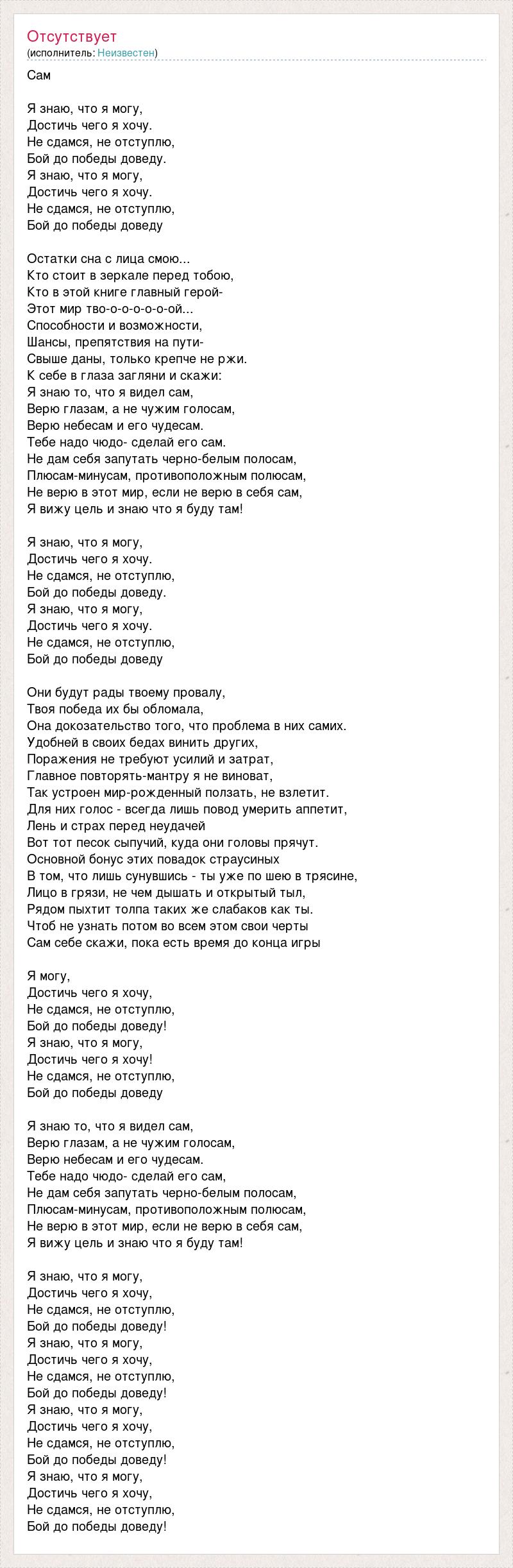 Сам Я знаю, что я могу, Достичь чего я хочу. Не сдамся, не отступлю, Бой до победы доведу. Я знаю, что я могу, Достичь чего я хочу. Не сдамся, не отступлю, Бой до победы доведу Остатки сна с лица смою... Кто стоит в зеркале перед тобою, Кто в этой книге главный герой- Этот мир тво-о-о-о-о-о-ой... Способности и возможности, Шансы, препятствия на пути- Свыше даны, только крепче не ржи. К себе в глаза загляни и скажи: Я знаю то, что я видел сам, Верю глазам, а не чужим голосам, Верю небесам и его чудесам. Тебе надо чюдо- сделай его сам. Не дам себя запутать черно-белым полосам, Плюсам-минусам, противоположным полюсам, Не верю в этот мир, если не верю в себя сам, Я вижу цель и знаю что я буду там! Я знаю, что я могу, Достичь чего я хочу. Не сдамся, не отступлю, Бой до победы доведу. Я знаю, что я могу, Достичь чего я хочу. Не сдамся, не отступлю, Бой до победы доведу Они будут рады твоему провалу, Твоя победа их бы обломала, Она докозательство того, что проблема в них самих. Удобней в своих бедах винить других, Поражения не требуют усилий и затрат, Главное повторять-мантру я не виноват, Так устроен мир-рожденный ползать, не взлетит. Для них голос - всегда лишь повод умерить аппетит, Лень и страх перед неудачей Вот тот песок сыпучий, куда они головы прячут. Основной бонус этих повадок страусиных В том, что лишь сунувшись - ты уже по шею в трясине, Лицо в грязи, не чем дышать и открытый тыл, Рядом пыхтит толпа таких же слабаков как ты. Чтоб не узнать потом во всем этом свои черты Сам себе скажи, пока есть время до конца игры Я могу, Достичь чего я хочу, Не сдамся, не отступлю, Бой до победы доведу! Я знаю, что я могу, Достичь чего я хочу! Не сдамся, не отступлю, Бой до победы доведу Я знаю то, что я видел сам, Верю глазам, а не чужим голосам, Верю небесам и его чудесам. Тебе надо чюдо- сделай его сам, Не дам себя запутать черно-белым полосам, Плюсам-минусам, противоположным полюсам, Не верю в этот мир, если не верю в себя сам, Я вижу цель и знаю что я буду там! Я знаю, что я могу, Достичь чего я хочу, Не сдамся, не отступлю, Бой до победы доведу! Я знаю, что я могу, Достичь чего я хочу, Не сдамся, не отступлю, Бой до победы доведу! Я знаю, что я могу, Достичь чего я хочу, Не сдамся, не отступлю, Бой до победы доведу! Я знаю, что я могу, Достичь чего я хочу, Не сдамся, не отступлю, Бой до победы доведу!