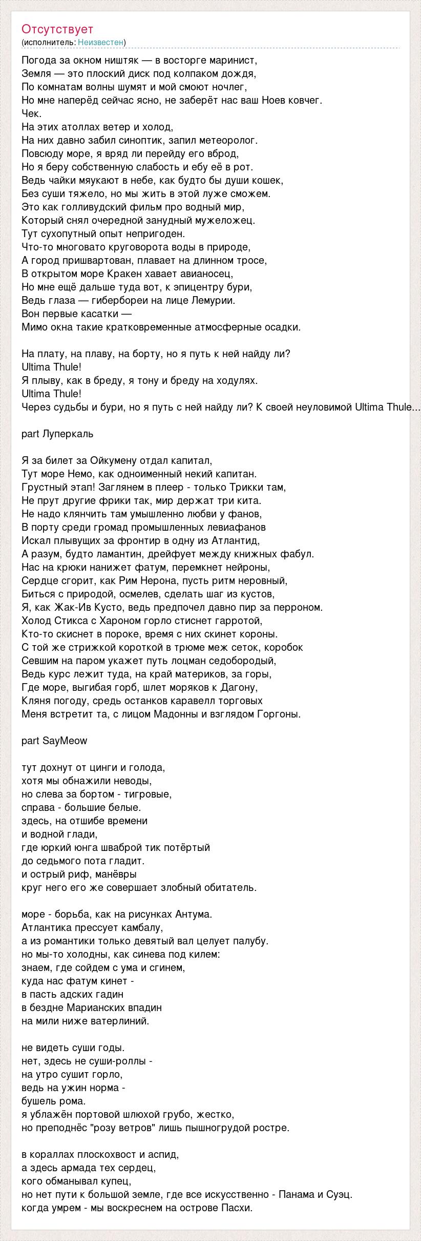 Погода за окном ништяк — в восторге маринист, Земля — это плоский диск под колпаком дождя, По комнатам волны шумят и мой смоют ночлег, Но мне наперёд сейчас ясно, не заберёт нас ваш Ноев ковчег. Чек. На этих атоллах ветер и холод, На них давно забил синоптик, запил метеоролог. Повсюду море, я вряд ли перейду его вброд, Но я беру собственную слабость и ебу её в рот. Ведь чайки мяукают в небе, как будто бы души кошек, Без суши тяжело, но мы жить в этой луже сможем. Это как голливудский фильм про водный мир, Который снял очередной занудный мужеложец. Тут сухопутный опыт непригоден. Что-то многовато круговорота воды в природе, А город пришвартован, плавает на длинном тросе, В открытом море Кракен хавает авианосец, Но мне ещё дальше туда вот, к эпицентру бури, Ведь глаза — гибербореи на лице Лемурии. Вон первые касатки — Мимо окна такие кратковременные атмосферные осадки. На плату, на плаву, на борту, но я путь к ней найду ли? Ultima Thule! Я плыву, как в бреду, я тону и бреду на ходулях. Ultima Thule! Через судьбы и бури, но я путь с ней найду ли? К своей неуловимой Ultima Thule... part Луперкаль Я за билет за Ойкумену отдал капитал, Тут море Немо, как одноименный некий капитан. Грустный этап! Заглянем в плеер - только Трикки там, Не прут другие фрики так, мир держат три кита. Не надо клянчить там умышленно любви у фанов, В порту среди громад промышленных левиафанов Искал плывущих за фронтир в одну из Атлантид, А разум, будто ламантин, дрейфует между книжных фабул. Нас на крюки нанижет фатум, перемкнет нейроны, Сердце сгорит, как Рим Нерона, пусть ритм неровный, Биться с природой, осмелев, сделать шаг из кустов, Я, как Жак-Ив Кусто, ведь предпочел давно пир за перроном. Холод Стикса с Хароном горло стиснет гарротой, Кто-то скиснет в пороке, время с них скинет короны. С той же стрижкой короткой в трюме меж сеток, коробок Севшим на паром укажет путь лоцман седобородый, Ведь курс лежит туда, на край материков, за горы, Где море, выгибая горб, шлет моряков к Дагону, Кляня погоду, средь останков каравелл торговых Меня встретит та, с лицом Мадонны и взглядом Горгоны. part SayMeow тут дохнут от цинги и голода, хотя мы обнажили неводы, но слева за бортом - тигровые, справа - большие белые. здесь, на отшибе времени и водной глади, где юркий юнга шваброй тик потёртый до седьмого пота гладит. и острый риф, манёвры круг него его же совершает злобный обитатель. море - борьба, как на рисунках Антума. Атлантика прессует камбалу, а из романтики только девятый вал целует палубу. но мы-то холодны, как синева под килем: знаем, где сойдем с ума и сгинем, куда нас фатум кинет - в пасть адских гадин в бездне Марианских впадин на мили ниже ватерлиний. не видеть суши годы. нет, здесь не суши-роллы - на утро сушит горло, ведь на ужин норма - бушель рома. я ублажён портовой шлюхой грубо, жестко, но преподнёс "розу ветров" лишь пышногрудой ростре. в кораллах плоскохвост и аспид, а здесь армада тех сердец, кого обманывал купец, но нет пути к большой земле, где все искусственно - Панама и Суэц. когда умрем - мы воскреснем на острове Пасхи.