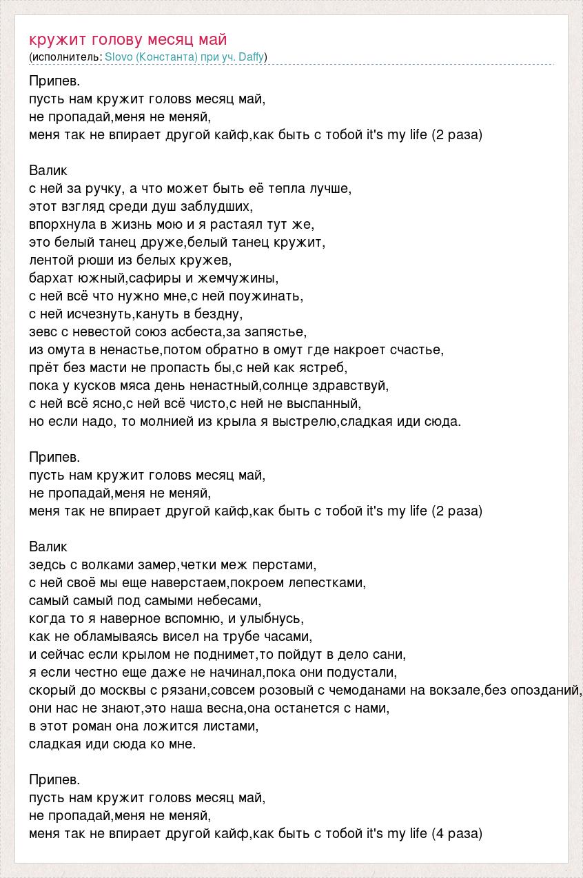 Припев. пусть нам кружит головs месяц май, не пропадай,меня не меняй, меня так не впирает другой кайф,как быть с тобой it's my life (2 раза) Валик с ней за ручку, а что может быть её тепла лучше, этот взгляд среди душ заблудших, впорхнула в жизнь мою и я растаял тут же, это белый танец друже,белый танец кружит, лентой рюши из белых кружев, бархат южный,сафиры и жемчужины, с ней всё что нужно мне,с ней поужинать, с ней исчезнуть,кануть в бездну, зевс с невестой союз асбеста,за запястье, из омута в ненастье,потом обратно в омут где накроет счастье, прёт без масти не пропасть бы,с ней как ястреб, пока у кусков мяса день ненастный,солнце здравствуй, с ней всё ясно,с ней всё чисто,с ней не выспанный, но если надо, то молнией из крыла я выстрелю,сладкая иди сюда. Припев. пусть нам кружит головs месяц май, не пропадай,меня не меняй, меня так не впирает другой кайф,как быть с тобой it's my life (2 раза) Валик зедсь с волками замер,четки меж перстами, с ней своё мы еще наверстаем,покроем лепестками, самый самый под самыми небесами, когда то я наверное вспомню, и улыбнусь, как не обламываясь висел на трубе часами, и сейчас если крылом не поднимет,то пойдут в дело сани, я если честно еще даже не начинал,пока они подустали, скорый до москвы с рязани,совсем розовый с чемоданами на вокзале,без опозданий, они нас не знают,это наша весна,она останется с нами, в этот роман она ложится листами, сладкая иди сюда ко мне. Припев. пусть нам кружит головs месяц май, не пропадай,меня не меняй, меня так не впирает другой кайф,как быть с тобой it's my life (4 раза)