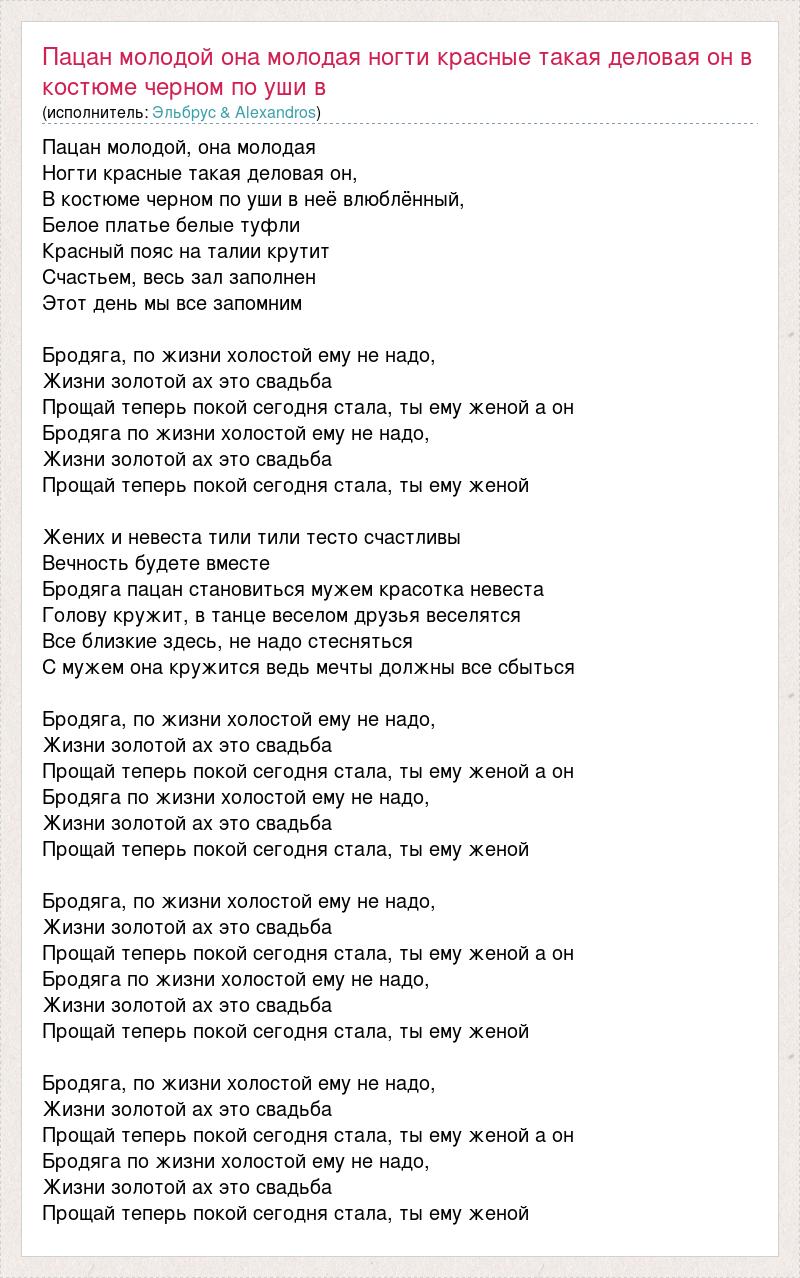 Пацан молодой, она молодая Ногти красные такая деловая он, В костюме черном по уши в неё влюблённый, Белое платье белые туфли Красный пояс на талии крутит Счастьем, весь зал заполнен Этот день мы все запомним Бродяга, по жизни холостой ему не надо, Жизни золотой ах это свадьба Прощай теперь покой сегодня стала, ты ему женой а он Бродяга по жизни холостой ему не надо, Жизни золотой ах это свадьба Прощай теперь покой сегодня стала, ты ему женой Жених и невеста тили тили тесто счастливы Вечность будете вместе Бродяга пацан становиться мужем красотка невеста Голову кружит, в танце веселом друзья веселятся Все близкие здесь, не надо стесняться С мужем она кружится ведь мечты должны все сбыться Бродяга, по жизни холостой ему не надо, Жизни золотой ах это свадьба Прощай теперь покой сегодня стала, ты ему женой а он Бродяга по жизни холостой ему не надо, Жизни золотой ах это свадьба Прощай теперь покой сегодня стала, ты ему женой Бродяга, по жизни холостой ему не надо, Жизни золотой ах это свадьба Прощай теперь покой сегодня стала, ты ему женой а он Бродяга по жизни холостой ему не надо, Жизни золотой ах это свадьба Прощай теперь покой сегодня стала, ты ему женой Бродяга, по жизни холостой ему не надо, Жизни золотой ах это свадьба Прощай теперь покой сегодня стала, ты ему женой а он Бродяга по жизни холостой ему не надо, Жизни золотой ах это свадьба Прощай теперь покой сегодня стала, ты ему женой