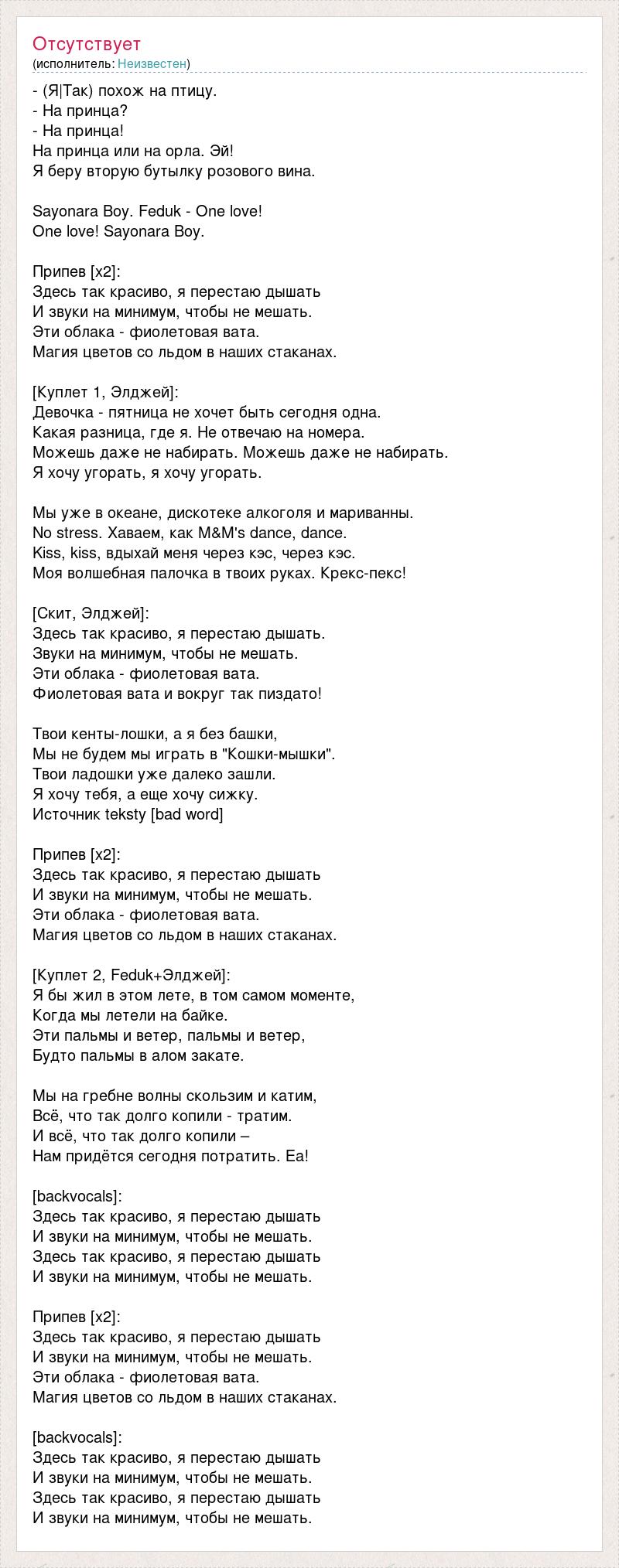 - (Я|Так) похож на птицу. - На принца? - На принца! На принца или на орла. Эй! Я беру вторую бутылку розового вина. Sayonara Boy. Feduk - One love! One love! Sayonara Boy. Припев [x2]: Здесь так красиво, я перестаю дышать И звуки на минимум, чтобы не мешать. Эти облака - фиолетовая вата. Магия цветов со льдом в наших стаканах. [Куплет 1, Элджей]: Девочка - пятница не хочет быть сегодня одна. Какая разница, где я. Не отвечаю на номера. Можешь даже не набирать. Можешь даже не набирать. Я хочу угорать, я хочу угорать. Мы уже в океане, дискотеке алкоголя и мариванны. No stress. Хаваем, как M&M's dance, dance. Kiss, kiss, вдыхай меня через кэс, через кэс. Моя волшебная палочка в твоих руках. Крекс-пекс! [Скит, Элджей]: Здесь так красиво, я перестаю дышать. Звуки на минимум, чтобы не мешать. Эти облака - фиолетовая вата. Фиолетовая вата и вокруг так пиздато! Твои кенты-лошки, а я без башки, Мы не будем мы играть в "Кошки-мышки". Твои ладошки уже далеко зашли. Я хочу тебя, а еще хочу сижку. Источник teksty [bad word] Припев [x2]: Здесь так красиво, я перестаю дышать И звуки на минимум, чтобы не мешать. Эти облака - фиолетовая вата. Магия цветов со льдом в наших стаканах. [Куплет 2, Feduk+Элджей]: Я бы жил в этом лете, в том самом моменте, Когда мы летели на байке. Эти пальмы и ветер, пальмы и ветер, Будто пальмы в алом закате. Мы на гребне волны скользим и катим, Всё, что так долго копили - тратим. И всё, что так долго копили – Нам придётся сегодня потратить. Еа! [backvocals]: Здесь так красиво, я перестаю дышать И звуки на минимум, чтобы не мешать. Здесь так красиво, я перестаю дышать И звуки на минимум, чтобы не мешать. Припев [x2]: Здесь так красиво, я перестаю дышать И звуки на минимум, чтобы не мешать. Эти облака - фиолетовая вата. Магия цветов со льдом в наших стаканах. [backvocals]: Здесь так красиво, я перестаю дышать И звуки на минимум, чтобы не мешать. Здесь так красиво, я перестаю дышать И звуки на минимум, чтобы не мешать.