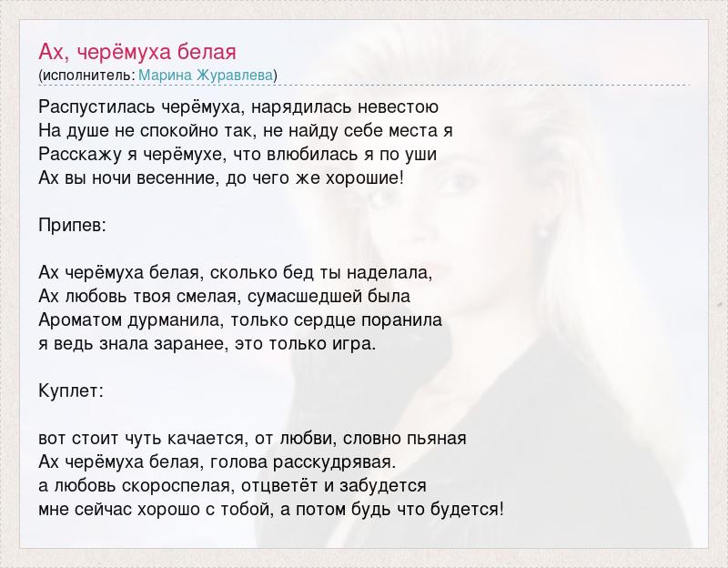 Распустилась черёмуха, нарядилась невестою На душе не спокойно так, не найду себе места я Расскажу я черёмухе, что влюбилась я по уши Ах вы ночи весенние, до чего же хорошие! Припев: Ах черёмуха белая, сколько бед ты наделала, Ах любовь твоя смелая, сумаcшедшей была Ароматом дурманила, только сердце поранила я ведь знала заранее, это только игра. Куплет: вот стоит чуть качается, от любви, словно пьяная Ах черёмуха белая, голова расскудрявая. а любовь скороспелая, отцветёт и забудется мне сейчас хорошо с тобой, а потом будь что будется!