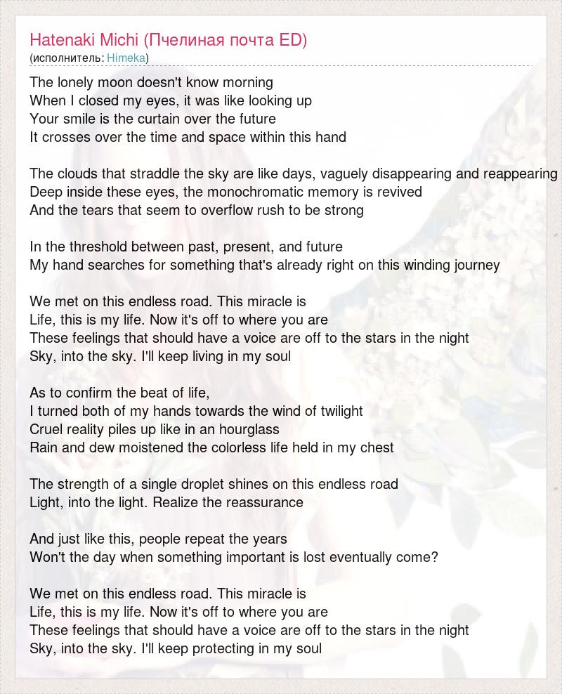 The lonely moon doesn't know morning When I closed my eyes, it was like looking up Your smile is the curtain over the future It crosses over the time and space within this hand The clouds that straddle the sky are like days, vaguely disappearing and reappearing Deep inside these eyes, the monochromatic memory is revived And the tears that seem to overflow rush to be strong In the threshold between past, present, and future My hand searches for something that's already right on this winding journey We met on this endless road. This miracle is Life, this is my life. Now it's off to where you are These feelings that should have a voice are off to the stars in the night Sky, into the sky. I'll keep living in my soul As to confirm the beat of life, I turned both of my hands towards the wind of twilight Cruel reality piles up like in an hourglass Rain and dew moistened the colorless life held in my chest The strength of a single droplet shines on this endless road Light, into the light. Realize the reassurance And just like this, people repeat the years Won't the day when something important is lost eventually come? We met on this endless road. This miracle is Life, this is my life. Now it's off to where you are These feelings that should have a voice are off to the stars in the night Sky, into the sky. I'll keep protecting in my soul