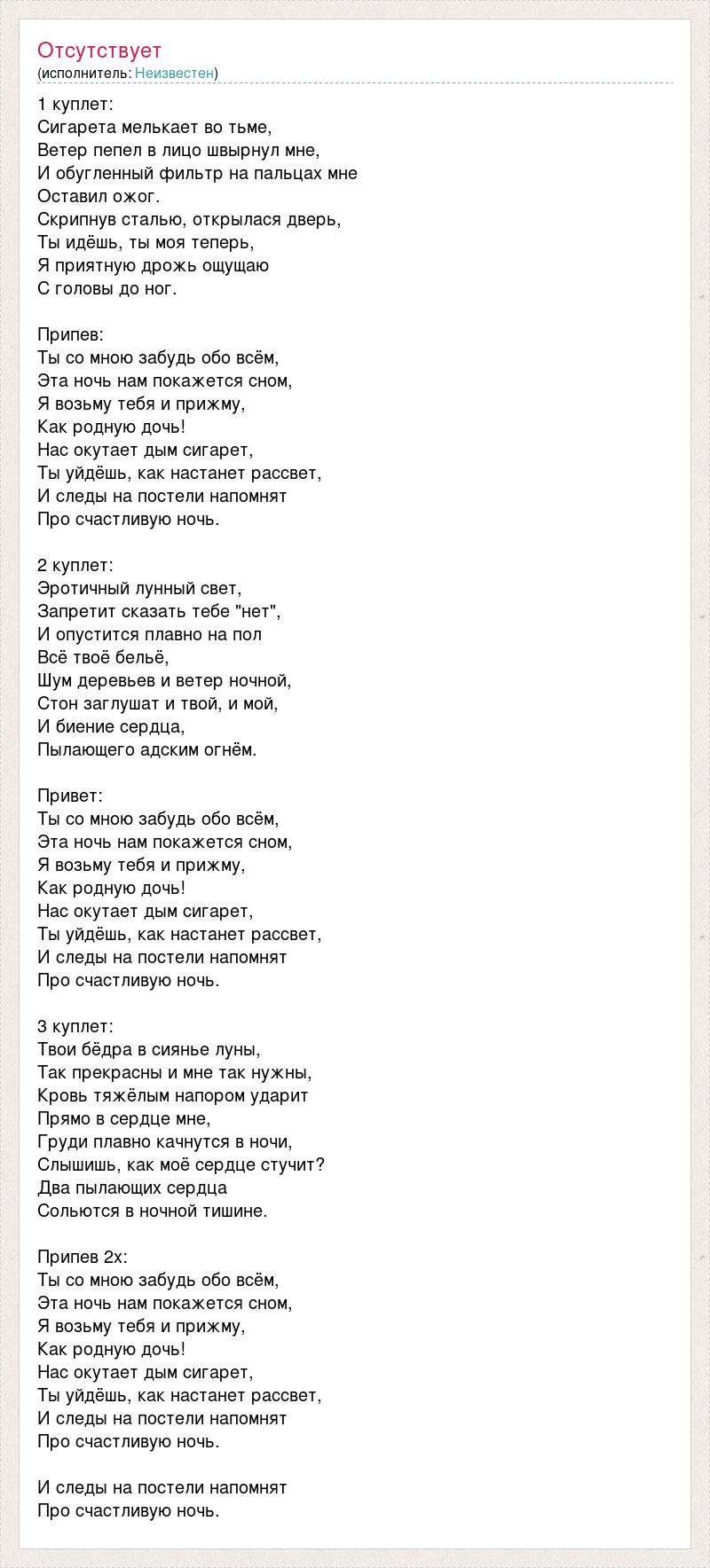 1 куплет: Сигарета мелькает во тьме, Ветер пепел в лицо швырнул мне, И обугленный фильтр на пальцах мне Оставил ожог. Скрипнув сталью, открылася дверь, Ты идёшь, ты моя теперь, Я приятную дрожь ощущаю С головы до ног. Припев: Ты со мною забудь обо всём, Эта ночь нам покажется сном, Я возьму тебя и прижму, Как родную дочь! Hас окутает дым сигарет, Ты уйдёшь, как настанет рассвет, И следы на постели напомнят Про счастливую ночь. 2 куплет: Эротичный лунный свет, Запретит сказать тебе "нет", И опустится плавно на пол Всё твоё бельё, Шум деревьев и ветер ночной, Стон заглушат и твой, и мой, И биение сердца, Пылающего адским огнём. Привет: Ты со мною забудь обо всём, Эта ночь нам покажется сном, Я возьму тебя и прижму, Как родную дочь! Hас окутает дым сигарет, Ты уйдёшь, как настанет рассвет, И следы на постели напомнят Про счастливую ночь. 3 куплет: Твои бёдра в сиянье луны, Так прекрасны и мне так нужны, Кровь тяжёлым напором ударит Прямо в сердце мне, Груди плавно качнутся в ночи, Слышишь, как моё сердце стучит? Два пылающих сердца Сольются в ночной тишине. Припев 2х: Ты со мною забудь обо всём, Эта ночь нам покажется сном, Я возьму тебя и прижму, Как родную дочь! Hас окутает дым сигарет, Ты уйдёшь, как настанет рассвет, И следы на постели напомнят Про счастливую ночь. И следы на постели напомнят Про счастливую ночь.