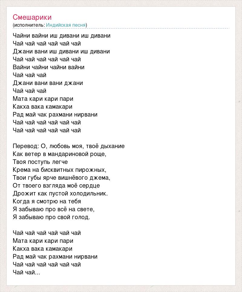 Чайни вайни иш дивани иш дивани Чай чай чай чай чай чай Джани вани иш дивани иш дивани Чай чай чай чай чай чай Вайни чайни чайни вайни Чай чай чай Джани вани вани джани Чай чай чай Мата кари кари пари Какха вака камакари Рад май чак рахмани нирвани Чай чай чай чай чай чай Чай чай чай чай чай чай Перевод: О, любовь моя, твоё дыхание Как ветер в мандариновой роще, Твоя поступь легче Крема на бисквитных пирожных, Твои губы ярче вишнёвого джема, От твоего взгляда моё сердце Дрожит как пустой холодильник. Когда я смотрю на тебя Я забываю про всё на свете, Я забываю про свой голод. Чай чай чай чай чай чай Мата кари кари пари Какха вака камакари Рад май чак рахмани нирвани Чай чай чай чай чай чай Чай чай...