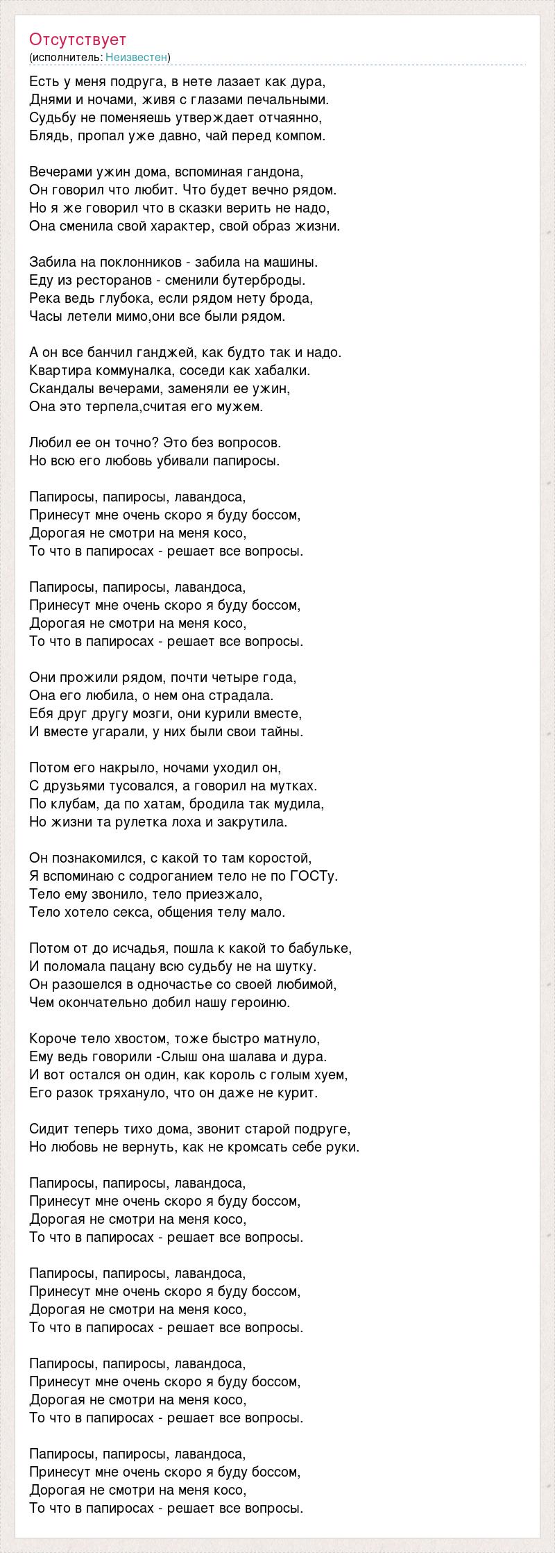 Есть у меня подруга, в нете лазает как дура, Днями и ночами, живя с глазами печальными. Судьбу не поменяешь утверждает отчаянно, Блядь, пропал уже давно, чай перед компом. Вечерами ужин дома, вспоминая гандона, Он говорил что любит. Что будет вечно рядом. Но я же говорил что в сказки верить не надо, Она сменила свой характер, свой образ жизни. Забила на поклонников - забила на машины. Еду из ресторанов - сменили бутерброды. Река ведь глубока, если рядом нету брода, Часы летели мимо,они все были рядом. А он все банчил ганджей, как будто так и надо. Квартира коммуналка, соседи как хабалки. Скандалы вечерами, заменяли ее ужин, Она это терпела,считая его мужем. Любил ее он точно? Это без вопросов. Но всю его любовь убивали папиросы. Папиросы, папиросы, лавандоса, Принесут мне очень скоро я буду боссом, Дорогая не смотри на меня косо, То что в папиросах - решает все вопросы. Папиросы, папиросы, лавандоса, Принесут мне очень скоро я буду боссом, Дорогая не смотри на меня косо, То что в папиросах - решает все вопросы. Они прожили рядом, почти четыре года, Она его любила, о нем она страдала. Ебя друг другу мозги, они курили вместе, И вместе угарали, у них были свои тайны. Потом его накрыло, ночами уходил он, С друзьями тусовался, а говорил на мутках. По клубам, да по хатам, бродила так мудила, Но жизни та рулетка лоха и закрутила. Он познакомился, с какой то там коростой, Я вспоминаю с содроганием тело не по ГОСТу. Тело ему звонило, тело приезжало, Тело хотело секса, общения телу мало. Потом от до исчадья, пошла к какой то бабульке, И поломала пацану всю судьбу не на шутку. Он разошелся в одночастье со своей любимой, Чем окончательно добил нашу героиню. Короче тело хвостом, тоже быстро матнуло, Ему ведь говорили -Слыш она шалава и дура. И вот остался он один, как король с голым хуем, Его разок тряхануло, что он даже не курит. Сидит теперь тихо дома, звонит старой подруге, Но любовь не вернуть, как не кромсать себе руки. Папиросы, папиросы, лавандоса, Принесут мне очень скоро я буду боссом, Дорогая не смотри на меня косо, То что в папиросах - решает все вопросы. Папиросы, папиросы, лавандоса, Принесут мне очень скоро я буду боссом, Дорогая не смотри на меня косо, То что в папиросах - решает все вопросы. Папиросы, папиросы, лавандоса, Принесут мне очень скоро я буду боссом, Дорогая не смотри на меня косо, То что в папиросах - решает все вопросы. Папиросы, папиросы, лавандоса, Принесут мне очень скоро я буду боссом, Дорогая не смотри на меня косо, То что в папиросах - решает все вопросы.