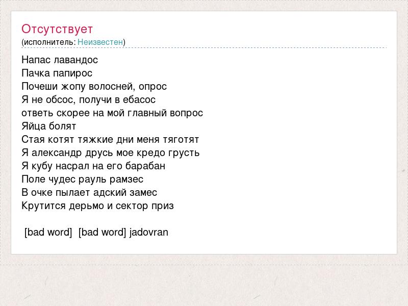 Напас лавандос Пачка папирос Почеши жопу волосней, опрос Я не обсос, получи в ебасос ответь скорее на мой главный вопрос Яйца болят Стая котят тяжкие дни меня тяготят Я александр друсь мое кредо грусть Я кубу насрал на его барабан Поле чудес рауль рамзес В очке пылает адский замес Крутится дерьмо и сектор приз [bad word] [bad word] jadovran