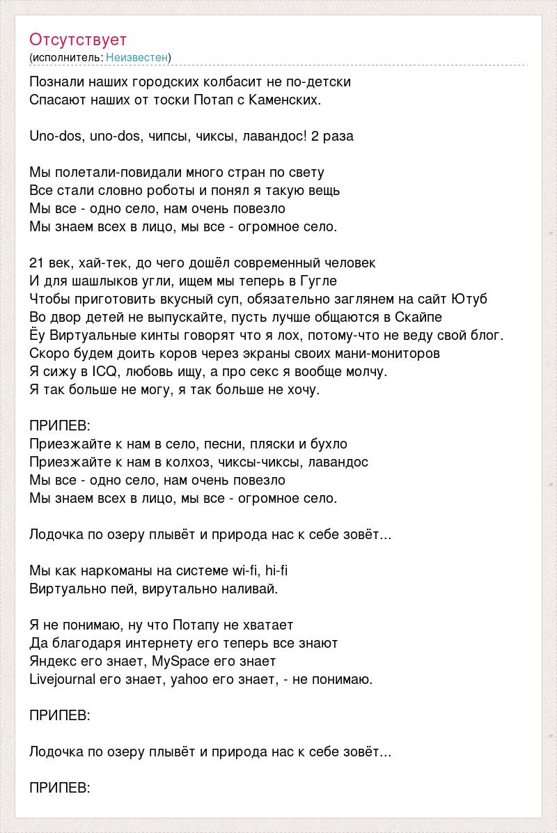 Познали наших городских колбасит не по-детски Спасают наших от тоски Потап с Каменских. Uno-dos, uno-dos, чипсы, чиксы, лавандос! 2 раза Мы полетали-повидали много стран по свету Все стали словно роботы и понял я такую вещь Мы все - одно село, нам очень повезло Мы знаем всех в лицо, мы все - огромное село. 21 век, хай-тек, до чего дошёл современный человек И для шашлыков угли, ищем мы теперь в Гугле Чтобы приготовить вкусный суп, обязательно заглянем на сайт Ютуб Во двор детей не выпускайте, пусть лучше общаются в Скайпе Ёу Виртуальные кинты говорят что я лох, потому-что не веду свой блог. Скоро будем доить коров через экраны своих мани-мониторов Я сижу в ICQ, любовь ищу, а про секс я вообще молчу. Я так больше не могу, я так больше не хочу. ПРИПЕВ: Приезжайте к нам в село, песни, пляски и бухло Приезжайте к нам в колхоз, чиксы-чиксы, лавандос Мы все - одно село, нам очень повезло Мы знаем всех в лицо, мы все - огромное село. Лодочка по озеру плывёт и природа нас к себе зовёт... Мы как наркоманы на системе wi-fi, hi-fi Виртуально пей, вирутально наливай. Я не понимаю, ну что Потапу не хватает Да благодаря интернету его теперь все знают Яндекс его знает, MySpace его знает Livejournal его знает, yahoo его знает, - не понимаю. ПРИПЕВ: Лодочка по озеру плывёт и природа нас к себе зовёт... ПРИПЕВ: