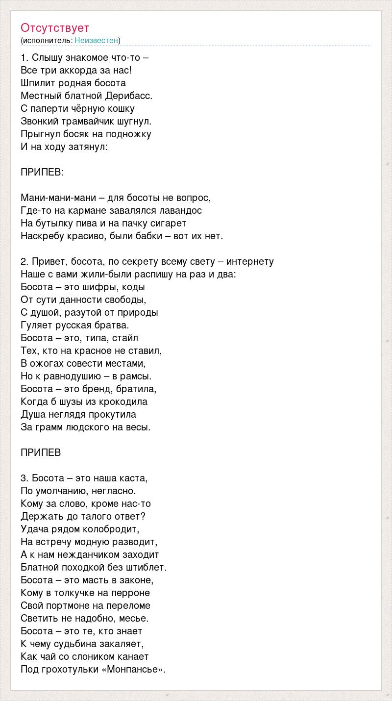 1. Слышу знакомое что-то – Все три аккорда за нас! Шпилит родная босота Местный блатной Дерибасс. С паперти чёрную кошку Звонкий трамвайчик шугнул. Прыгнул босяк на подножку И на ходу затянул: ПРИПЕВ: Мани-мани-мани – для босоты не вопрос, Где-то на кармане завалялся лавандос На бутылку пива и на пачку сигарет Наскребу красиво, были бабки – вот их нет. 2. Привет, босота, по секрету всему свету – интернету Наше с вами жили-были распишу на раз и два: Босота – это шифры, коды От сути данности свободы, С душой, разутой от природы Гуляет русская братва. Босота – это, типа, стайл Тех, кто на красное не ставил, В ожогах совести местами, Но к равнодушию – в рамсы. Босота – это бренд, братила, Когда б шузы из крокодила Душа неглядя прокутила За грамм людского на весы. ПРИПЕВ 3. Босота – это наша каста, По умолчанию, негласно. Кому за слово, кроме нас-то Держать до талого ответ? Удача рядом колобродит, На встречу модную разводит, А к нам нежданчиком заходит Блатной походкой без штиблет. Босота – это масть в законе, Кому в толкучке на перроне Свой портмоне на переломе Светить не надобно, месье. Босота – это те, кто знает К чему судьбина закаляет, Как чай со слоником канает Под грохотульки «Монпансье».
