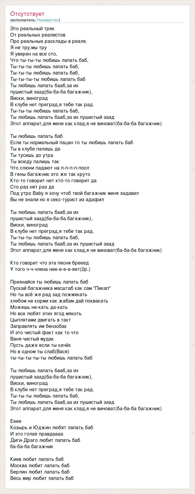 Это реальный трек От реальных реалистов Про реальные расклады в реале. Я не тру,мы тру Я уверен на все сто, Что ты-ты-ты любишь лапать баб, Ты-ты-ты любишь лапать баб, Ты-ты-ты любишь лапать баб, Ты-ты-ты-ты любишь лапать баб Ты любишь лапать бааб,за их пушистый заад(ба-ба-ба багажник), Виски, виноград В клубе нет преград,я тебе так рад. Ты-ты-ты любишь лапать баб, Ты любишь лапать бааб,за их пушистый заад Этот аппарат,для меня как клад,я не виноват(ба-ба-ба багажник) Ты любишь лапать баб Если ты нормальный пацан то ты любишь лапать баб Ты в клубе палишь да Ты тусишь до утра Ты всюду палишь так Что слюни падают на п-п-п-п-поол В гены багажник это же так круто Кто-то говорит нет кто-то говорит да Сто раз нет раз да Под утро Baby я хочу чтоб твой багажник меня задавил Вы не знали но я секс-турист из адафил Ты любишь лапать бааб,за их пушистый заад(ба-ба-ба багажник), Виски, виноград В клубе нет преград,я тебе так рад. Ты-ты-ты любишь лапать баб, Ты любишь лапать бааб,за их пушистый заад Этот аппарат,для меня как клад,я не виноват(ба-ба-ба багажник) Кто говорит что эта песня брееед У того ч-ч-члена нее-е-е-е-еет(2р.) Признайся ты любишь лапать баб Пускай багажника масштаб как сам "Пикап" Но ты всё же рад зад пожмякать хлебом не корми как жабам дай поквакать Можешь не-кать да-кать Но все любят этих ягод мякоть Цыплятами двигать в такт Заправлять им бензобак И это чистый факт как то что Ваня чистый мудак Пусть даже если ты качёк Но в одном ты слаб(Вася) ты-ты-ты-ты-ты любишь лапать баб Ты любишь лапать бааб,за их пушистый заад(ба-ба-ба багажник), Виски, виноград В клубе нет преград,я тебе так рад. Ты-ты-ты любишь лапать баб, Ты любишь лапать бааб,за их пушистый заад Этот аппарат,для меня как клад,я не виноват(ба-ба-ба багажник) Ееее Козырь и Юджин любят лапать баб И это голая правдаааа Диги-Драго любит лапать баб ба-ба-ба багажник Киев любит лапать баб Москва любит лапать баб Берлин любит лапать баб Весь мир любит лапать баб