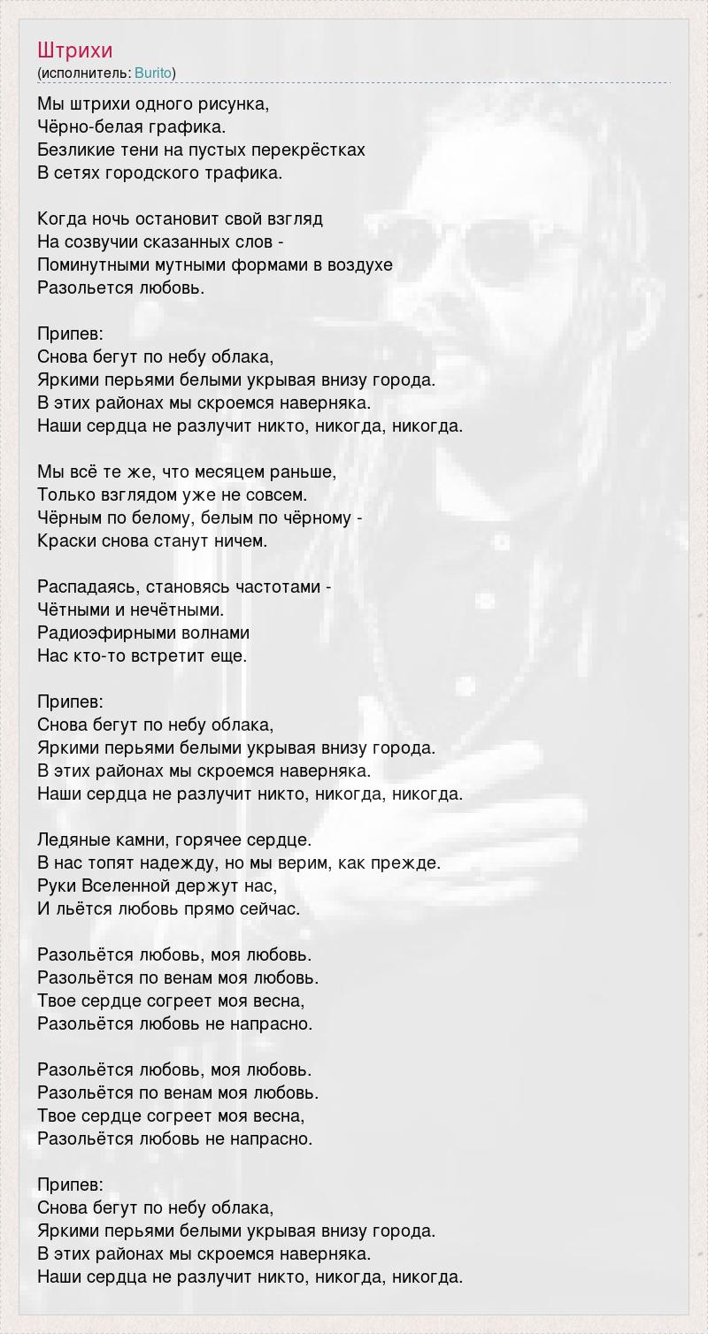 Мы штрихи одного рисунка, Чёрно-белая графика. Безликие тени на пустых перекрёстках В сетях городского трафика. Когда ночь остановит свой взгляд На созвучии сказанных слов - Поминутными мутными формами в воздухе Разольется любовь. Припев: Снова бегут по небу облака, Яркими перьями белыми укрывая внизу города. В этих районах мы скроемся наверняка. Наши сердца не разлучит никто, никогда, никогда. Мы всё те же, что месяцем раньше, Только взглядом уже не совсем. Чёрным по белому, белым по чёрному - Краски снова станут ничем. Распадаясь, становясь частотами - Чётными и нечётными. Радиоэфирными волнами Нас кто-то встретит еще. Припев: Снова бегут по небу облака, Яркими перьями белыми укрывая внизу города. В этих районах мы скроемся наверняка. Наши сердца не разлучит никто, никогда, никогда. Ледяные камни, горячее сердце. В нас топят надежду, но мы верим, как прежде. Руки Вселенной держут нас, И льётся любовь прямо сейчас. Разольётся любовь, моя любовь. Разольётся по венам моя любовь. Твое сердце согреет моя весна, Разольётся любовь не напрасно. Разольётся любовь, моя любовь. Разольётся по венам моя любовь. Твое сердце согреет моя весна, Разольётся любовь не напрасно. Припев: Снова бегут по небу облака, Яркими перьями белыми укрывая внизу города. В этих районах мы скроемся наверняка. Наши сердца не разлучит никто, никогда, никогда.