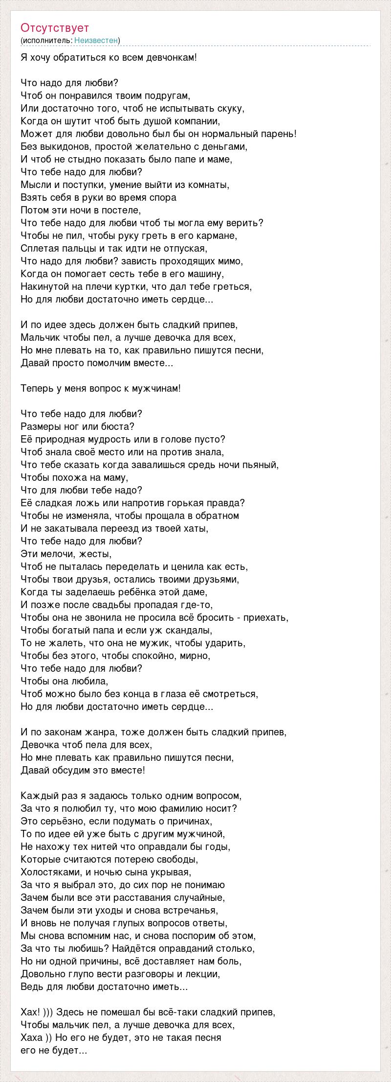 Я хочу обратиться ко всем девчонкам! Что надо для любви? Чтоб он понравился твоим подругам, Или достаточно того, чтоб не испытывать скуку, Когда он шутит чтоб быть душой компании, Может для любви довольно был бы он нормальный парень! Без выкидонов, простой желательно с деньгами, И чтоб не стыдно показать было папе и маме, Что тебе надо для любви? Мысли и поступки, умение выйти из комнаты, Взять себя в руки во время спора Потом эти ночи в постеле, Что тебе надо для любви чтоб ты могла ему верить? Чтобы не пил, чтобы руку греть в его кармане, Сплетая пальцы и так идти не отпуская, Что надо для любви? зависть проходящих мимо, Когда он помогает сесть тебе в его машину, Накинутой на плечи куртки, что дал тебе греться, Но для любви достаточно иметь сердце... И по идее здесь должен быть сладкий припев, Мальчик чтобы пел, а лучше девочка для всех, Но мне плевать на то, как правильно пишутся песни, Давай просто помолчим вместе... Теперь у меня вопрос к мужчинам! Что тебе надо для любви? Размеры ног или бюста? Её природная мудрость или в голове пусто? Чтоб знала своё место или на против знала, Что тебе сказать когда завалишься средь ночи пьяный, Чтобы похожа на маму, Что для любви тебе надо? Её сладкая ложь или напротив горькая правда? Чтобы не изменяла, чтобы прощала в обратном И не закатывала переезд из твоей хаты, Что тебе надо для любви? Эти мелочи, жесты, Чтоб не пыталась переделать и ценила как есть, Чтобы твои друзья, остались твоими друзьями, Когда ты заделаешь ребёнка этой даме, И позже после свадьбы пропадая где-то, Чтобы она не звонила не просила всё бросить - приехать, Чтобы богатый папа и если уж скандалы, То не жалеть, что она не мужик, чтобы ударить, Чтобы без этого, чтобы спокойно, мирно, Что тебе надо для любви? Чтобы она любила, Чтоб можно было без конца в глаза её смотреться, Но для любви достаточно иметь сердце... И по законам жанра, тоже должен быть сладкий припев, Девочка чтоб пела для всех, Но мне плевать как правильно пишутся песни, Давай обсудим это вместе! Каждый раз я задаюcь только одним вопросом, За что я полюбил ту, что мою фамилию носит? Это серьёзно, если подумать о причинах, То по идее ей уже быть с другим мужчиной, Не нахожу тех нитей что оправдали бы годы, Которые считаются потерею свободы, Холостяками, и ночью сына укрывая, За что я выбрал это, до сих пор не понимаю Зачем были все эти расставания случайные, Зачем были эти уходы и снова встречанья, И вновь не получая глупых вопросов ответы, Мы снова вспомним нас, и снова поспорим об этом, За что ты любишь? Найдётся оправданий столько, Но ни одной причины, всё доставляет нам боль, Довольно глупо вести разговоры и лекции, Ведь для любви достаточно иметь... Хах! ))) Здесь не помешал бы всё-таки сладкий припев, Чтобы мальчик пел, а лучше девочка для всех, Хаха )) Но его не будет, это не такая песня его не будет...