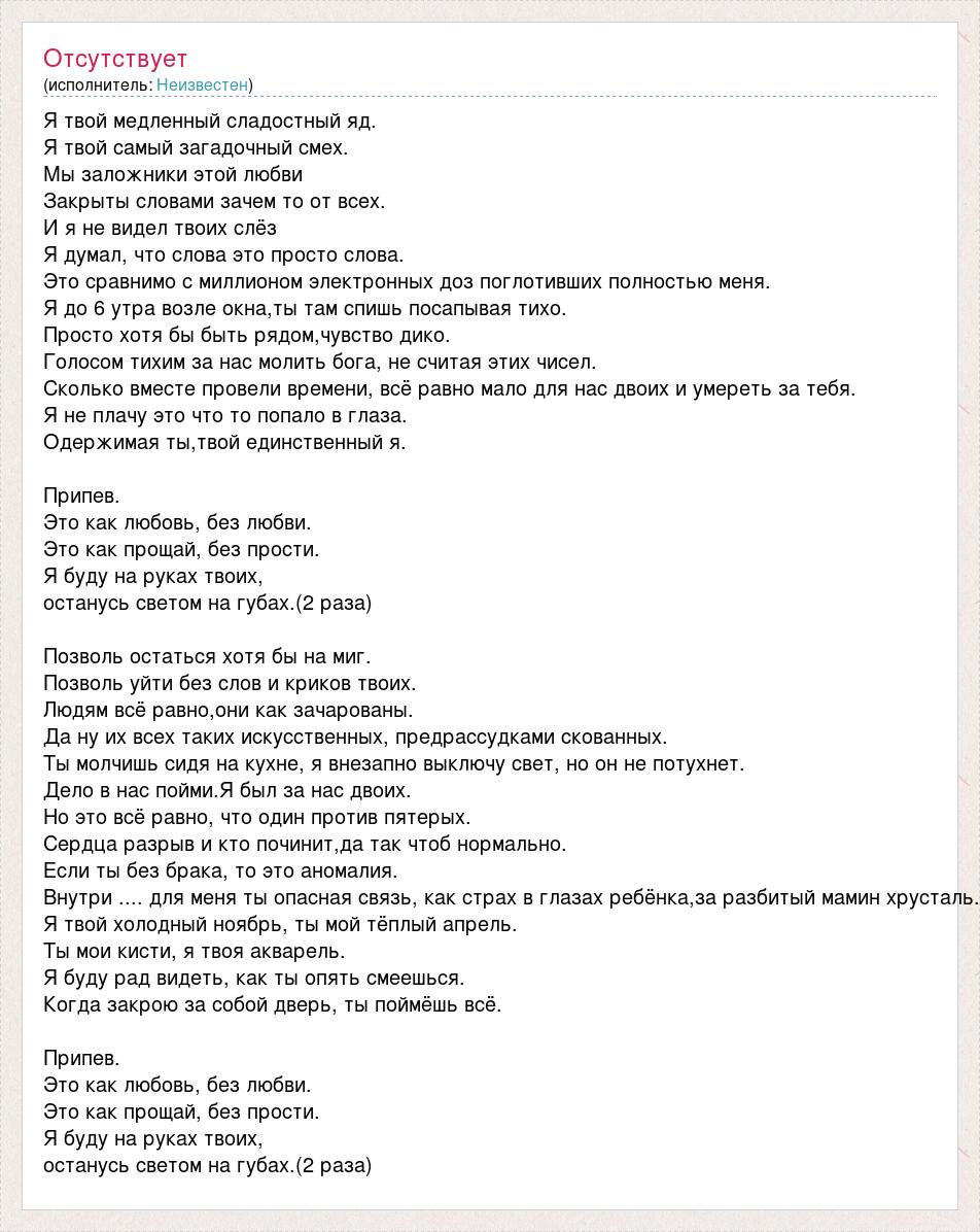 Я твой медленный сладостный яд. Я твой самый загадочный смех. Мы заложники этой любви Закрыты словами зачем то от всех. И я не видел твоих слёз Я думал, что слова это просто слова. Это сравнимо с миллионом электронных доз поглотивших полностью меня. Я до 6 утра возле окна,ты там спишь посапывая тихо. Просто хотя бы быть рядом,чувство дико. Голосом тихим за нас молить бога, не считая этих чисел. Сколько вместе провели времени, всё равно мало для нас двоих и умереть за тебя. Я не плачу это что то попало в глаза. Одержимая ты,твой единственный я. Припев. Это как любовь, без любви. Это как прощай, без прости. Я буду на руках твоих, останусь светом на губах.(2 раза) Позволь остаться хотя бы на миг. Позволь уйти без слов и криков твоих. Людям всё равно,они как зачарованы. Да ну их всех таких искусственных, предрассудками скованных. Ты молчишь сидя на кухне, я внезапно выключу свет, но он не потухнет. Дело в нас пойми.Я был за нас двоих. Но это всё равно, что один против пятерых. Сердца разрыв и кто починит,да так чтоб нормально. Если ты без брака, то это аномалия. Внутри .... для меня ты опасная связь, как страх в глазах ребёнка,за разбитый мамин хрусталь. Я твой холодный ноябрь, ты мой тёплый апрель. Ты мои кисти, я твоя акварель. Я буду рад видеть, как ты опять смеешься. Когда закрою за собой дверь, ты поймёшь всё. Припев. Это как любовь, без любви. Это как прощай, без прости. Я буду на руках твоих, останусь светом на губах.(2 раза)