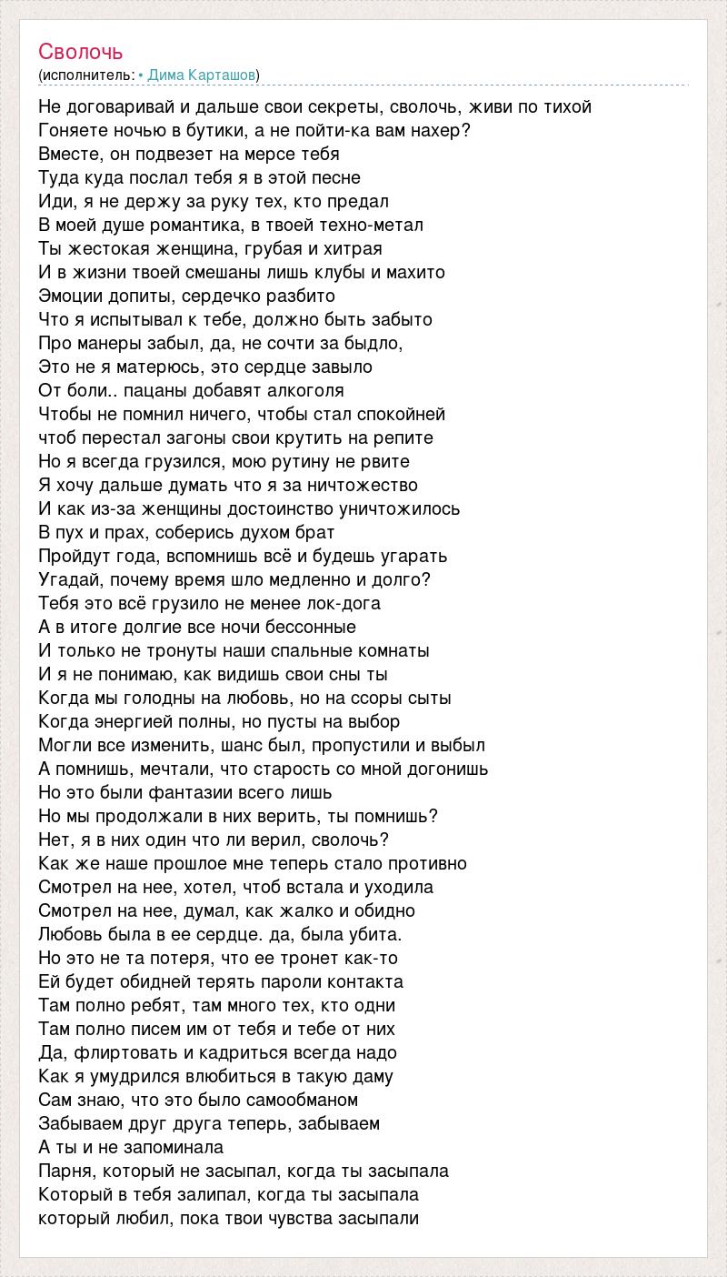 Не договаривай и дальше свои секреты, сволочь, живи по тихой Гоняете ночью в бутики, а не пойти-ка вам нахер? Вместе, он подвезет на мерсе тебя Туда куда послал тебя я в этой песне Иди, я не держу за руку тех, кто предал В моей душе романтика, в твоей техно-метал Ты жестокая женщина, грубая и хитрая И в жизни твоей смешаны лишь клубы и махито Эмоции допиты, сердечко разбито Что я испытывал к тебе, должно быть забыто Про манеры забыл, да, не сочти за быдло, Это не я матерюсь, это сердце завыло От боли.. пацаны добавят алкоголя Чтобы не помнил ничего, чтобы стал спокойней чтоб перестал загоны свои крутить на репите Но я всегда грузился, мою рутину не рвите Я хочу дальше думать что я за ничтожество И как из-за женщины достоинство уничтожилось В пух и прах, соберись духом брат Пройдут года, вспомнишь всё и будешь угарать Угадай, почему время шло медленно и долго? Тебя это всё грузило не менее лок-дога А в итоге долгие все ночи бессонные И только не тронуты наши спальные комнаты И я не понимаю, как видишь свои сны ты Когда мы голодны на любовь, но на ссоры сыты Когда энергией полны, но пусты на выбор Могли все изменить, шанс был, пропустили и выбыл А помнишь, мечтали, что старость со мной догонишь Но это были фантазии всего лишь Но мы продолжали в них верить, ты помнишь? Нет, я в них один что ли верил, сволочь? Как же наше прошлое мне теперь стало противно Смотрел на нее, хотел, чтоб встала и уходила Смотрел на нее, думал, как жалко и обидно Любовь была в ее сердце. да, была убита. Но это не та потеря, что ее тронет как-то Ей будет обидней терять пароли контакта Там полно ребят, там много тех, кто одни Там полно писем им от тебя и тебе от них Да, флиртовать и кадриться всегда надо Как я умудрился влюбиться в такую даму Сам знаю, что это было самообманом Забываем друг друга теперь, забываем А ты и не запоминала Парня, который не засыпал, когда ты засыпала Который в тебя залипал, когда ты засыпала который любил, пока твои чувства засыпали