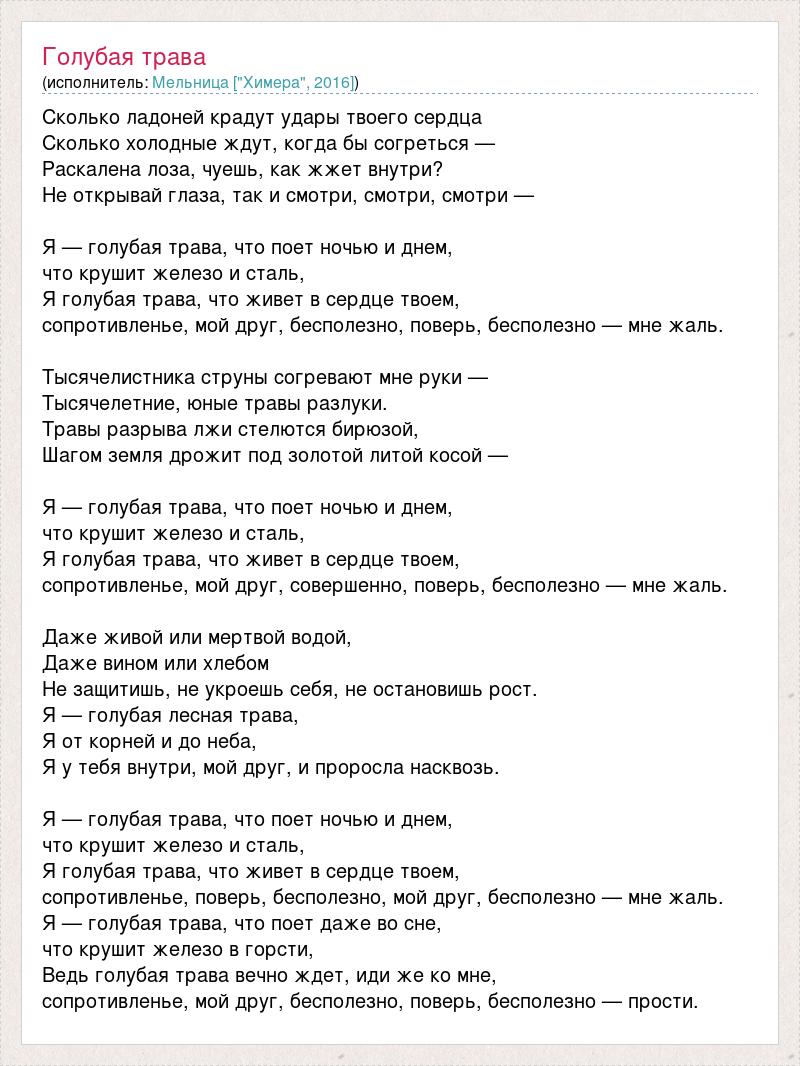 Сколько ладоней крадут удары твоего сердца Сколько холодные ждут, когда бы согреться — Раскалена лоза, чуешь, как жжет внутри? Не открывай глаза, так и смотри, смотри, смотри — Я — голубая трава, что поет ночью и днем, что крушит железо и сталь, Я голубая трава, что живет в сердце твоем, сопротивленье, мой друг, бесполезно, поверь, бесполезно — мне жаль. Тысячелистника струны согревают мне руки — Тысячелетние, юные травы разлуки. Травы разрыва лжи стелются бирюзой, Шагом земля дрожит под золотой литой косой — Я — голубая трава, что поет ночью и днем, что крушит железо и сталь, Я голубая трава, что живет в сердце твоем, сопротивленье, мой друг, совершенно, поверь, бесполезно — мне жаль. Даже живой или мертвой водой, Даже вином или хлебом Не защитишь, не укроешь себя, не остановишь рост. Я — голубая лесная трава, Я от корней и до неба, Я у тебя внутри, мой друг, и проросла насквозь. Я — голубая трава, что поет ночью и днем, что крушит железо и сталь, Я голубая трава, что живет в сердце твоем, сопротивленье, поверь, бесполезно, мой друг, бесполезно — мне жаль. Я — голубая трава, что поет даже во сне, что крушит железо в горсти, Ведь голубая трава вечно ждет, иди же ко мне, сопротивленье, мой друг, бесполезно, поверь, бесполезно — прости.