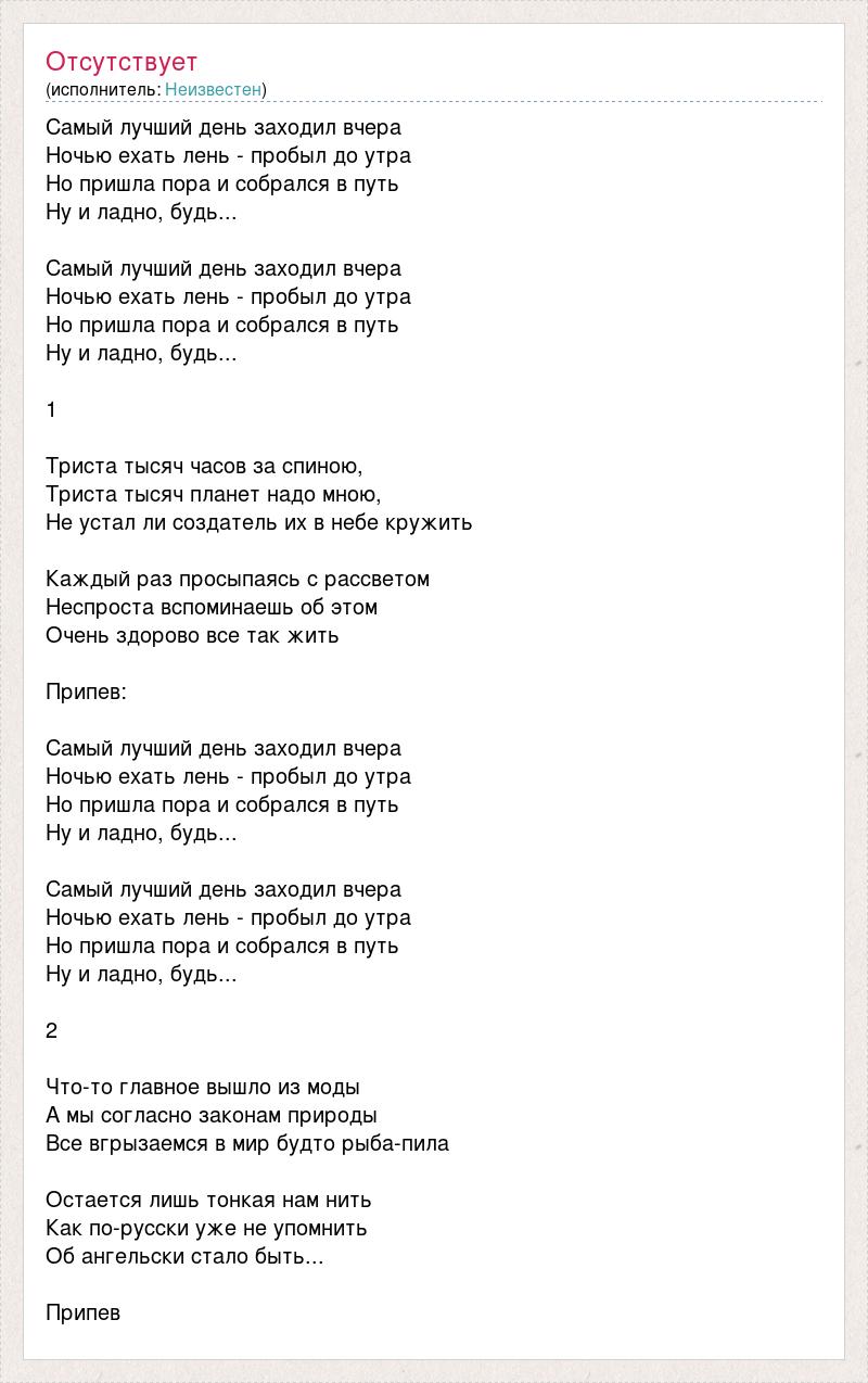 Самый лучший день заходил вчера Ночью ехать лень - пробыл до утра Но пришла пора и собрался в путь Ну и ладно, будь... Самый лучший день заходил вчера Ночью ехать лень - пробыл до утра Но пришла пора и собрался в путь Ну и ладно, будь... 1 Триста тысяч часов за спиною, Триста тысяч планет надо мною, Не устал ли создатель их в небе кружить Каждый раз просыпаясь с рассветом Неспроста вспоминаешь об этом Очень здорово все так жить Припев: Самый лучший день заходил вчера Ночью ехать лень - пробыл до утра Но пришла пора и собрался в путь Ну и ладно, будь... Самый лучший день заходил вчера Ночью ехать лень - пробыл до утра Но пришла пора и собрался в путь Ну и ладно, будь... 2 Что-то главное вышло из моды А мы согласно законам природы Все вгрызаемся в мир будто рыба-пила Остается лишь тонкая нам нить Как по-русски уже не упомнить Об ангельски стало быть... Припев