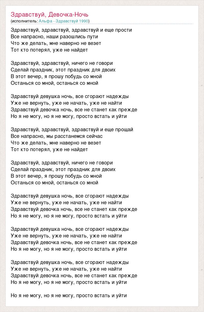 Здравствуй, здравствуй, здравствуй и еще прости Все напрасно, наши разошлись пути Что же делать, мне наверно не везет Тот кто потерял, уже не найдет Здравствуй, здравствуй, ничего не говори Сделай праздник, этот праздник для двоих В этот вечер, я прошу побудь со мной Останься со мной, останься со мной Здравствуй девушка ночь, все сгорают надежды Уже не вернуть, уже не начать, уже не найти Здравствуй девочка ночь, все не станет как прежде Но я не могу, но я не могу, просто встать и уйти Здравствуй, здравствуй, здравствуй и еще прощай Все напрасно, мы расcтанемся сейчас Что же делать, мне наверно не везет Тот кто потерял, уже не найдет Здравствуй, здравствуй, ничего не говори Сделай праздник, этот праздник для двоих В этот вечер, я прошу побудь со мной Останься со мной, останься со мной Здравствуй девушка ночь, все сгорают надежды Уже не вернуть, уже не начать, уже не найти Здравствуй девочка ночь, все не станет как прежде Но я не могу, но я не могу, просто встать и уйти Здравствуй девушка ночь, все сгорают надежды Уже не вернуть, уже не начать, уже не найти Здравствуй девочка ночь, все не станет как прежде Но я не могу, но я не могу, просто встать и уйти Здравствуй девушка ночь, все сгорают надежды Уже не вернуть, уже не начать, уже не найти Здравствуй девочка ночь, все не станет как прежде Но я не могу, но я не могу, просто встать и уйти Но я не могу, но я не могу, просто встать и уйти