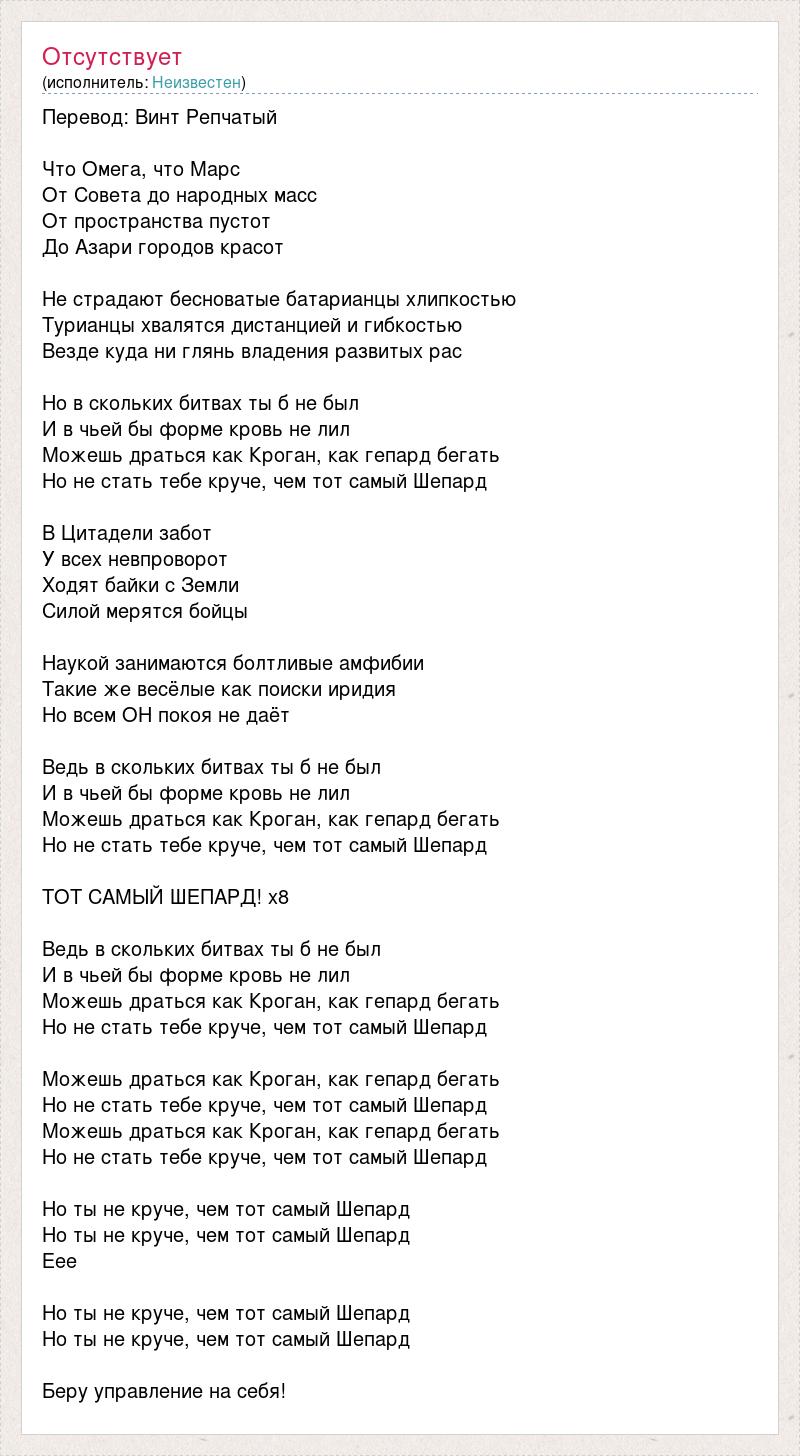 Перевод: Винт Репчатый Что Омега, что Марс От Совета до народных масс От пространства пустот До Азари городов красот Не страдают бесноватые батарианцы хлипкостью Турианцы хвалятся дистанцией и гибкостью Везде куда ни глянь владения развитых рас Но в скольких битвах ты б не был И в чьей бы форме кровь не лил Можешь драться как Кроган, как гепард бегать Но не стать тебе круче, чем тот самый Шепард В Цитадели забот У всех невпроворот Ходят байки с Земли Силой мерятся бойцы Наукой занимаются болтливые амфибии Такие же весёлые как поиски иридия Но всем ОН покоя не даёт Ведь в скольких битвах ты б не был И в чьей бы форме кровь не лил Можешь драться как Кроган, как гепард бегать Но не стать тебе круче, чем тот самый Шепард ТОТ САМЫЙ ШЕПАРД! х8 Ведь в скольких битвах ты б не был И в чьей бы форме кровь не лил Можешь драться как Кроган, как гепард бегать Но не стать тебе круче, чем тот самый Шепард Можешь драться как Кроган, как гепард бегать Но не стать тебе круче, чем тот самый Шепард Можешь драться как Кроган, как гепард бегать Но не стать тебе круче, чем тот самый Шепард Но ты не круче, чем тот самый Шепард Но ты не круче, чем тот самый Шепард Еее Но ты не круче, чем тот самый Шепард Но ты не круче, чем тот самый Шепард Беру управление на себя!