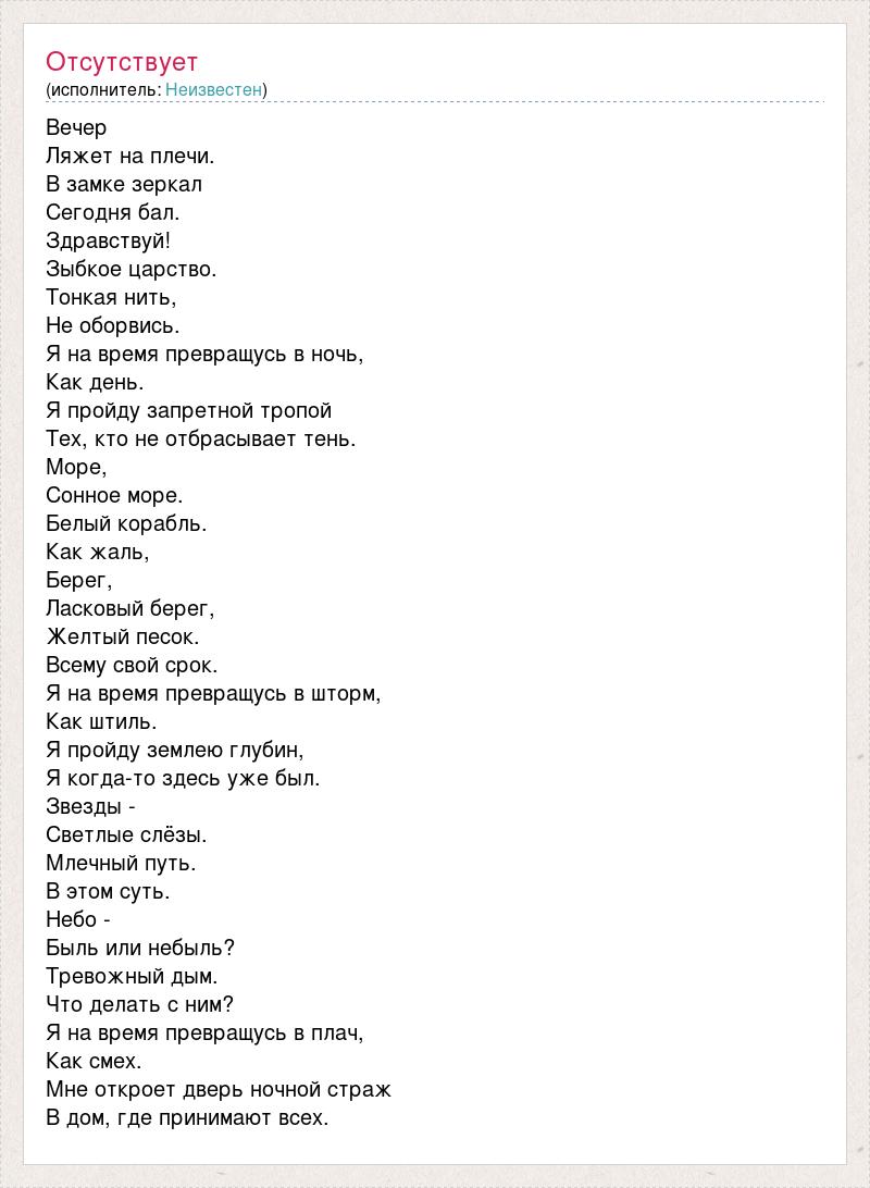 Вечер Ляжет на плечи. В замке зеркал Сегодня бал. Здравствуй! Зыбкое царство. Тонкая нить, Не оборвись. Я на время превращусь в ночь, Как день. Я пройду запретной тропой Тех, кто не отбрасывает тень. Море, Сонное море. Белый корабль. Как жаль, Берег, Ласковый берег, Желтый песок. Всему свой срок. Я на время превращусь в шторм, Как штиль. Я пройду землею глубин, Я когда-то здесь уже был. Звезды - Светлые слёзы. Млечный путь. В этом суть. Небо - Быль или небыль? Тревожный дым. Что делать с ним? Я на время превращусь в плач, Как смех. Мне откроет дверь ночной страж В дом, где принимают всех.