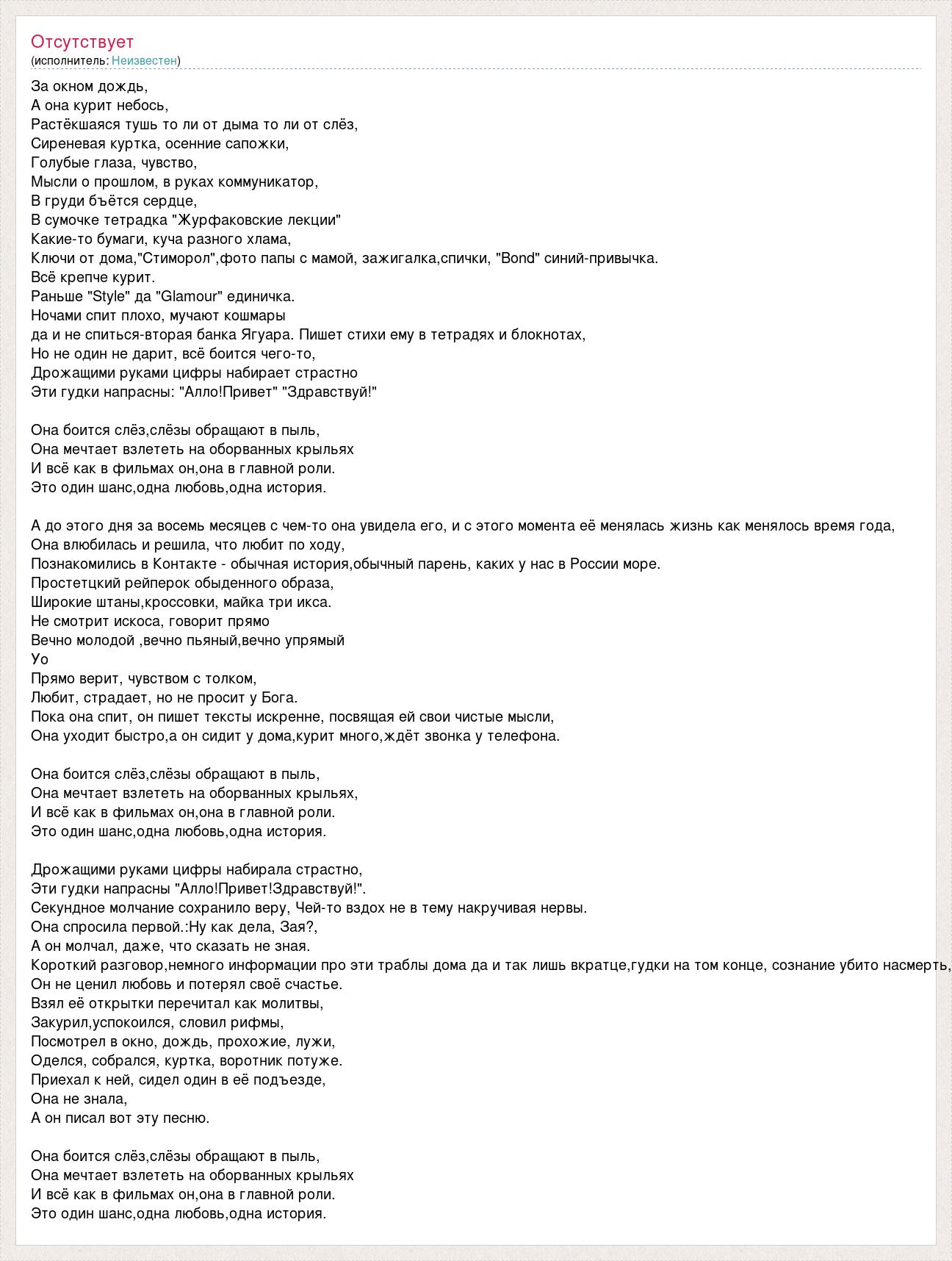 За окном дождь, А она курит небось, Растёкшаяся тушь то ли от дыма то ли от слёз, Сиреневая куртка, осенние сапожки, Голубые глаза, чувство, Мысли о прошлом, в руках коммуникатор, В груди бъётся сердце, В сумочке тетрадка "Журфаковские лекции" Какие-то бумаги, куча разного хлама, Ключи от дома,"Стиморол",фото папы с мамой, зажигалка,спички, "Bond" синий-привычка. Всё крепче курит. Раньше "Style" да "Glamour" единичка. Ночами спит плохо, мучают кошмары да и не спиться-вторая банка Ягуара. Пишет стихи ему в тетрадях и блокнотах, Но не один не дарит, всё боится чего-то, Дрожащими руками цифры набирает страстно Эти гудки напрасны: "Алло!Привет" "Здравствуй!" Она боится слёз,слёзы обращают в пыль, Она мечтает взлететь на оборванных крыльях И всё как в фильмах он,она в главной роли. Это один шанс,одна любовь,одна история. А до этого дня за восемь месяцев с чем-то она увидела его, и с этого момента её менялась жизнь как менялось время года, Она влюбилась и решила, что любит по ходу, Познакомились в Контакте - обычная история,обычный парень, каких у нас в России море. Простетцкий рейперок обыденного образа, Широкие штаны,кроссовки, майка три икса. Не смотрит искоса, говорит прямо Вечно молодой ,вечно пьяный,вечно упрямый Уo Прямо верит, чувством с толком, Любит, страдает, но не просит у Бога. Пока она спит, он пишет тексты искренне, посвящая ей свои чистые мысли, Она уходит быстро,а он сидит у дома,курит много,ждёт звонка у телефона. Она боится слёз,слёзы обращают в пыль, Она мечтает взлететь на оборванных крыльях, И всё как в фильмах он,она в главной роли. Это один шанс,одна любовь,одна история. Дрожащими руками цифры набирала страстно, Эти гудки напрасны "Алло!Привет!Здравствуй!". Секундное молчание сохранило веру, Чей-то вздох не в тему накручивая нервы. Она спросила первой.:Ну как дела, Зая?, А он молчал, даже, что сказать не зная. Короткий разговор,немного информации про эти траблы дома да и так лишь вкратце,гудки на том конце, сознание убито насмерть, Он не ценил любовь и потерял своё счастье. Взял её открытки перечитал как молитвы, Закурил,успокоился, словил рифмы, Посмотрел в окно, дождь, прохожие, лужи, Оделся, собрался, куртка, воротник потуже. Приехал к ней, сидел один в её подъезде, Она не знала, А он писал вот эту песню. Она боится слёз,слёзы обращают в пыль, Она мечтает взлететь на оборванных крыльях И всё как в фильмах он,она в главной роли. Это один шанс,одна любовь,одна история.