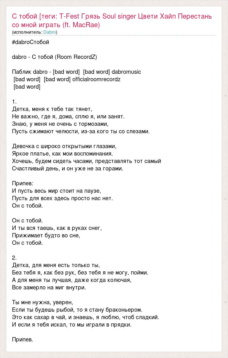#dabroСтобой dabro - С тобой (Room RecordZ) Паблик dabro - [bad word] [bad word] dabromusic [bad word] [bad word] officialroomrecordz [bad word] 1. Детка, меня к тебе так тянет, Не важно, где я, дома, сплю я, или занят. Знаю, у меня не очень с тормозами, Пусть сжимают челюсти, из-за кого ты со слезами. Девочка с широко открытыми глазами, Яркое платье, как мои воспоминания. Хочешь, будем сидеть часами, представлять тот самый Счастливый день, и он уже не за горами. Припев: И пусть весь мир стоит на паузе, Пусть для всех здесь просто нас нет. Он с тобой. Он с тобой. И ты вся таешь, как в руках снег, Прижимает будто во сне, Он с тобой. 2. Детка, для меня есть только ты, Без тебя я, как без рук, без тебя я не могу, пойми. А для меня ты лучшая, даже когда колючая, Все замерло на миг внутри. Ты мне нужна, уверен, Если ты будешь рыбой, то я стану браконьером. Это как сахар в чай, и знаешь, я люблю, чтоб сладкий. И если я тебя искал, то мы играли в прядки. Припев.