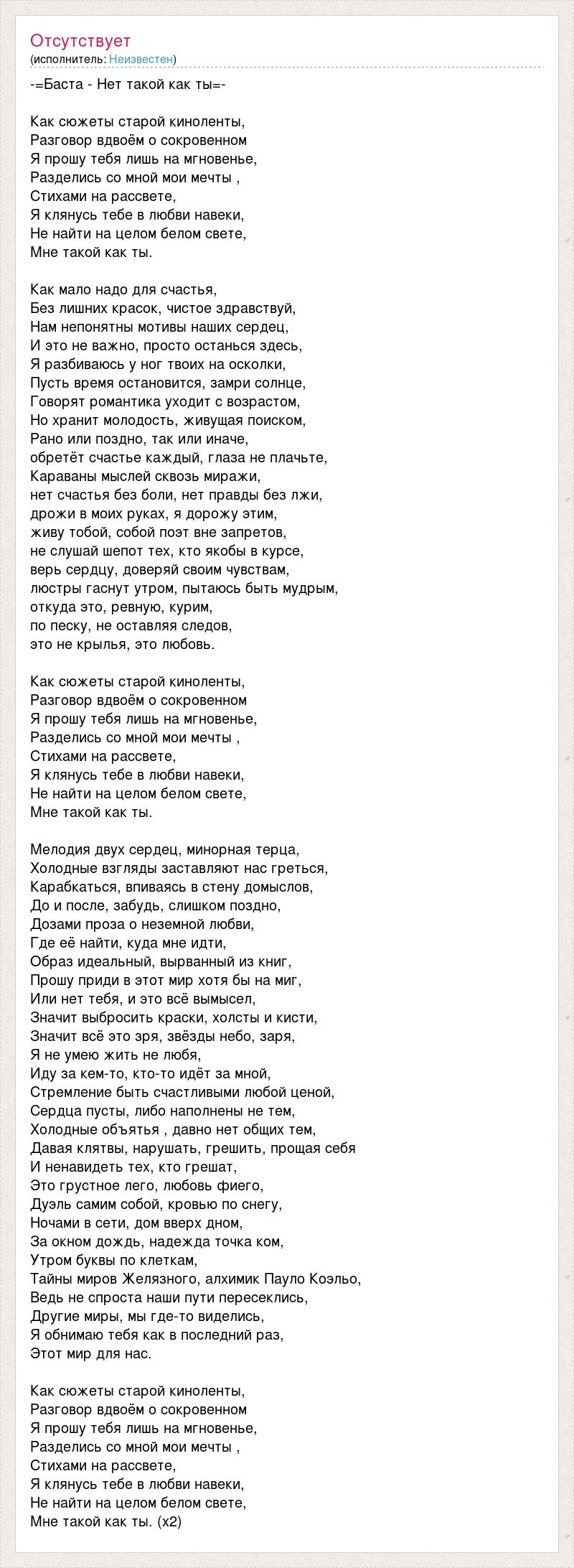 -=Баста - Нет такой как ты=- Как сюжеты старой киноленты, Разговор вдвоём о сокровенном Я прошу тебя лишь на мгновенье, Разделись со мной мои мечты , Стихами на рассвете, Я клянусь тебе в любви навеки, Не найти на целом белом свете, Мне такой как ты. Как мало надо для счастья, Без лишних красок, чистое здравствуй, Нам непонятны мотивы наших сердец, И это не важно, просто останься здесь, Я разбиваюсь у ног твоих на осколки, Пусть время остановится, замри солнце, Говорят романтика уходит с возрастом, Но хранит молодость, живущая поиском, Рано или поздно, так или иначе, обретёт счастье каждый, глаза не плачьте, Караваны мыслей сквозь миражи, нет счастья без боли, нет правды без лжи, дрожи в моих руках, я дорожу этим, живу тобой, собой поэт вне запретов, не слушай шепот тех, кто якобы в курсе, верь сердцу, доверяй своим чувствам, люстры гаснут утром, пытаюсь быть мудрым, откуда это, ревную, курим, по песку, не оставляя следов, это не крылья, это любовь. Как сюжеты старой киноленты, Разговор вдвоём о сокровенном Я прошу тебя лишь на мгновенье, Разделись со мной мои мечты , Стихами на рассвете, Я клянусь тебе в любви навеки, Не найти на целом белом свете, Мне такой как ты. Мелодия двух сердец, минорная терца, Холодные взгляды заставляют нас греться, Карабкаться, впиваясь в стену домыслов, До и после, забудь, слишком поздно, Дозами проза о неземной любви, Где её найти, куда мне идти, Образ идеальный, вырванный из книг, Прошу приди в этот мир хотя бы на миг, Или нет тебя, и это всё вымысел, Значит выбросить краски, холсты и кисти, Значит всё это зря, звёзды небо, заря, Я не умею жить не любя, Иду за кем-то, кто-то идёт за мной, Стремление быть счастливыми любой ценой, Сердца пусты, либо наполнены не тем, Холодные объятья , давно нет общих тем, Давая клятвы, нарушать, грешить, прощая себя И ненавидеть тех, кто грешат, Это грустное лего, любовь фиего, Дуэль самим собой, кровью по снегу, Ночами в сети, дом вверх дном, За окном дождь, надежда точка ком, Утром буквы по клеткам, Тайны миров Желязного, алхимик Пауло Коэльо, Ведь не спроста наши пути пересеклись, Другие миры, мы где-то виделись, Я обнимаю тебя как в последний раз, Этот мир для нас. Как сюжеты старой киноленты, Разговор вдвоём о сокровенном Я прошу тебя лишь на мгновенье, Разделись со мной мои мечты , Стихами на рассвете, Я клянусь тебе в любви навеки, Не найти на целом белом свете, Мне такой как ты. (х2)