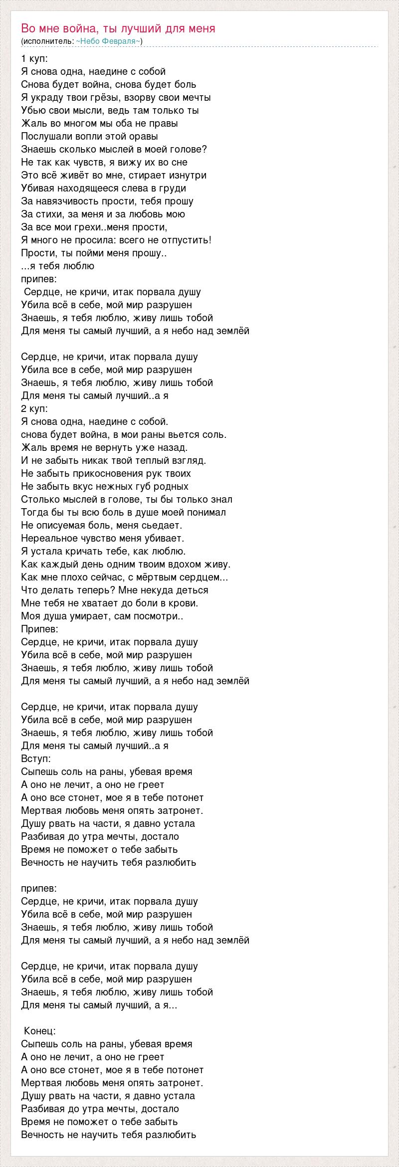 1 куп: Я снова одна, наедине с собой Снова будет война, снова будет боль Я украду твои грёзы, взорву свои мечты Убью свои мысли, ведь там только ты Жаль во многом мы оба не правы Послушали вопли этой оравы Знаешь сколько мыслей в моей голове? Не так как чувств, я вижу их во сне Это всё живёт во мне, стирает изнутри Убивая находящееся слева в груди За навязчивость прости, тебя прошу За стихи, за меня и за любовь мою За все мои грехи..меня прости, Я много не просила: всего не отпустить! Прости, ты пойми меня прошу.. ...я тебя люблю припев: Сердце, не кричи, итак порвала душу Убила всё в себе, мой мир разрушен Знаешь, я тебя люблю, живу лишь тобой Для меня ты самый лучший, а я небо над землёй Сердце, не кричи, итак порвала душу Убила все в себе, мой мир разрушен Знаешь, я тебя люблю, живу лишь тобой Для меня ты самый лучший..а я 2 куп: Я снова одна, наедине с собой. снова будет война, в мои раны вьется соль. Жаль время не вернуть уже назад. И не забыть никак твой теплый взгляд. Не забыть прикосновения рук твоих Не забыть вкус нежных губ родных Столько мыслей в голове, ты бы только знал Тогда бы ты всю боль в душе моей понимал Не описуемая боль, меня сьедает. Нереальное чувство меня убивает. Я устала кричать тебе, как люблю. Как каждый день одним твоим вдохом живу. Как мне плохо сейчас, с мёртвым сердцем... Что делать теперь? Мне некуда деться Мне тебя не хватает до боли в крови. Моя душа умирает, сам посмотри.. Припев: Сердце, не кричи, итак порвала душу Убила всё в себе, мой мир разрушен Знаешь, я тебя люблю, живу лишь тобой Для меня ты самый лучший, а я небо над землёй Сердце, не кричи, итак порвала душу Убила всё в себе, мой мир разрушен Знаешь, я тебя люблю, живу лишь тобой Для меня ты самый лучший..а я Вступ: Сыпешь соль на раны, убевая время А оно не лечит, а оно не греет А оно все стонет, мое я в тебе потонет Мертвая любовь меня опять затронет. Душу рвать на части, я давно устала Разбивая до утра мечты, достало Время не поможет о тебе забыть Вечность не научить тебя разлюбить припев: Сердце, не кричи, итак порвала душу Убила всё в себе, мой мир разрушен Знаешь, я тебя люблю, живу лишь тобой Для меня ты самый лучший, а я небо над землёй Сердце, не кричи, итак порвала душу Убила всё в себе, мой мир разрушен Знаешь, я тебя люблю, живу лишь тобой Для меня ты самый лучший, а я... Конец: Сыпешь соль на раны, убевая время А оно не лечит, а оно не греет А оно все стонет, мое я в тебе потонет Мертвая любовь меня опять затронет. Душу рвать на части, я давно устала Разбивая до утра мечты, достало Время не поможет о тебе забыть Вечность не научить тебя разлюбить