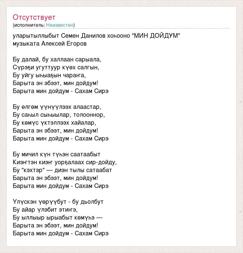 уларытыллыбыт Семен Данилов хоһооно "МИН ДОЙДУМ" музыката Алексей Егоров Бу далай, бу халлаан сарыала, Сүрэҕи угуттуур күөх салгын, Бу уйгу ыһыаҕын чараҥа, Барыта эн эбээт, мин дойдум! Барыта мин дойдум - Сахам Сирэ Бу өлгөм үүнүүлээх алаастар, Бу саһыл сыһыылар, толооннор, Бу көмүс үктэллээх хайалар, Барыта эн эбээт, мин дойдум! Барыта мин дойдум - Сахам Сирэ Бу мичил күн түһэн саатаабыт Киэҥтэн киэҥ уорҕалаах сир-дойду, Бу "кэхтэр" — диэн тылы сатаабат Барыта эн эбээт, мин дойдум! Барыта мин дойдум - Сахам Сирэ Yлүскэн үөрүүбут - бу дьолбут Бу айар үлэбит этиҥэ, Бу ыллыыр ырыабыт көмүһэ — Барыта эн эбээт, мин дойдум! Барыта мин дойдум - Сахам Сирэ