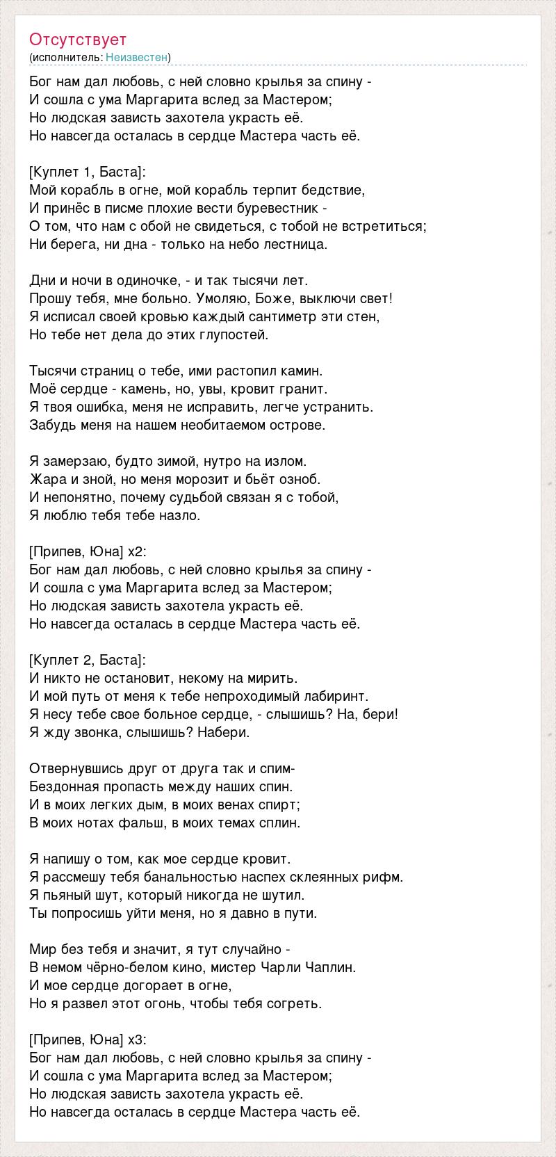 Бог нам дал любовь, с ней словно крылья за спину - И сошла с ума Маргарита вслед за Мастером; Но людская зависть захотела украсть её. Но навсегда осталась в сердце Мастера часть её. [Куплет 1, Баста]: Мой корабль в огне, мой корабль терпит бедствие, И принёс в писме плохие вести буревестник - О том, что нам с обой не свидеться, с тобой не встретиться; Ни берега, ни дна - только на небо лестница. Дни и ночи в одиночке, - и так тысячи лет. Прошу тебя, мне больно. Умоляю, Боже, выключи свет! Я исписал своей кровью каждый сантиметр эти стен, Но тебе нет дела до этих глупостей. Тысячи страниц о тебе, ими растопил камин. Моё сердце - камень, но, увы, кровит гранит. Я твоя ошибка, меня не исправить, легче устранить. Забудь меня на нашем необитаемом острове. Я замерзаю, будто зимой, нутро на излом. Жара и зной, но меня морозит и бьёт озноб. И непонятно, почему судьбой связан я с тобой, Я люблю тебя тебе назло. [Припев, Юна] x2: Бог нам дал любовь, с ней словно крылья за спину - И сошла с ума Маргарита вслед за Мастером; Но людская зависть захотела украсть её. Но навсегда осталась в сердце Мастера часть её. [Куплет 2, Баста]: И никто не остановит, некому на мирить. И мой путь от меня к тебе непроходимый лабиринт. Я несу тебе свое больное сердце, - слышишь? На, бери! Я жду звонка, слышишь? Набери. Отвернувшись друг от друга так и спим- Бездонная пропасть между наших спин. И в моих легких дым, в моих венах спирт; В моих нотах фальш, в моих темах сплин. Я напишу о том, как мое сердце кровит. Я рассмешу тебя банальностью наспех склеянных рифм. Я пьяный шут, который никогда не шутил. Ты попросишь уйти меня, но я давно в пути. Мир без тебя и значит, я тут случайно - В немом чёрно-белом кино, мистер Чарли Чаплин. И мое сердце догорает в огне, Но я развел этот огонь, чтобы тебя согреть. [Припев, Юна] x3: Бог нам дал любовь, с ней словно крылья за спину - И сошла с ума Маргарита вслед за Мастером; Но людская зависть захотела украсть её. Но навсегда осталась в сердце Мастера часть её.
