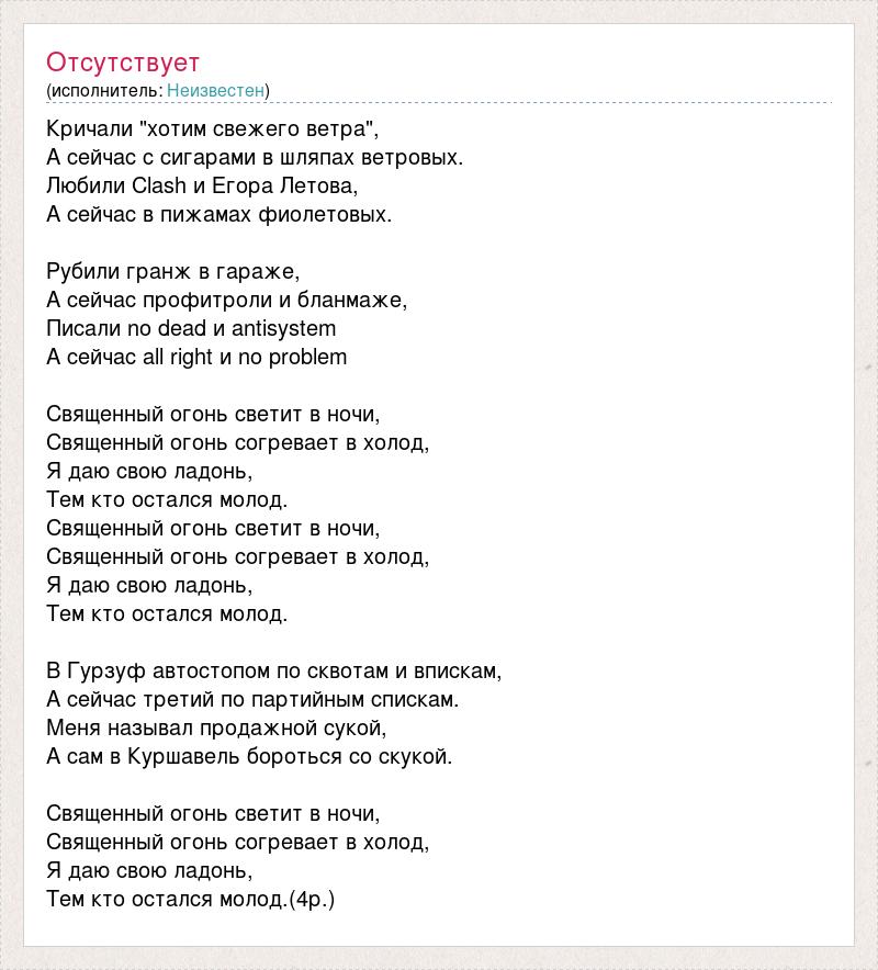 Кричали "хотим свежего ветра", А сейчас с сигарами в шляпах ветровых. Любили Clash и Егора Летова, А сейчас в пижамах фиолетовых. Рубили гранж в гараже, А сейчас профитроли и бланмаже, Писали no dead и antisystem А сейчас all right и no problem Священный огонь светит в ночи, Священный огонь согревает в холод, Я даю свою ладонь, Тем кто остался молод. Священный огонь светит в ночи, Священный огонь согревает в холод, Я даю свою ладонь, Тем кто остался молод. В Гурзуф автостопом по сквотам и впискам, А сейчас третий по партийным спискам. Меня называл продажной сукой, А сам в Куршавель бороться со скукой. Священный огонь светит в ночи, Священный огонь согревает в холод, Я даю свою ладонь, Тем кто остался молод.(4р.)