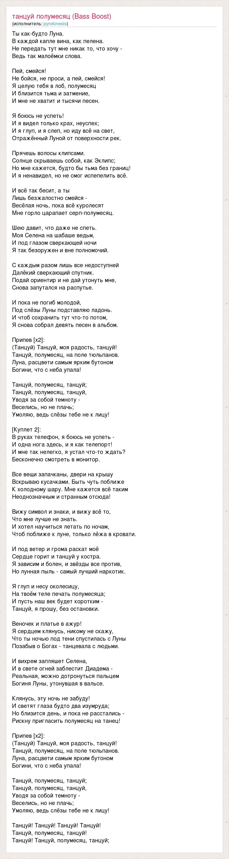 Ты как-будто Луна. В каждой капле вина, как пелена. Не передать тут мне никак то, что хочу - Ведь так малоёмки слова. Пей, смейся! Не бойся, не проси, а пей, смейся! Я целую тебя в лоб, полумесяц И близится тьма и затмение, И мне не хватит и тысячи песен. Я боюсь не успеть! И я видел только крах, неуспех; И я глуп, и я слеп, но иду всё на свет, Отражённый Луной от поверхности рек. Прячешь волосы клипсами. Солнце скрываешь собой, как Эклипс; Но мне кажется, будто бы тьма без границ! И я ненавидел, но не смог испепелить всё. И всё так бесит, а ты Лишь безжалостно смейся - Весёлая ночь, пока всё куролесят Мне горло царапает серп-полумесяц. Шею давит, что даже не спеть. Моя Селена на шабаше ведьм, И под глазом сверкающей ночи Я так безоружен и вне полномочий. С каждым разом лишь все недоступней Далёкий сверкающий спутник. Подай ориентир и не дай утонуть мне, Снова запутался на распутье. И пока не погиб молодой, Под слёзы Луны подставляю ладонь. И чтоб сохранить тут что-то потом, Я снова собрал девять песен в альбом. Припев [x2]: (Танцуй) Танцуй, моя радость, танцуй! Танцуй, полумесяц, на поле тюльпанов. Луна, расцвети самым ярким бутоном Богини, что с неба упала! Танцуй, полумесяц, танцуй; Танцуй, полумесяц, танцуй, Уводя за собой темноту - Веселись, но не плачь; Умоляю, ведь слёзы тебе не к лицу! [Куплет 2]: В руках телефон, я боюсь не успеть - И одна нога здесь, и я как телепорт! И мне так нелегко, я устал что-то ждать? Бесконечно смотреть в монитор. Все вещи запачканы, двери на крышу Вскрываю кусачками. Быть чуть поближе К холодному шару. Мне кажется всё таким Неоднозначным и странным отсюда! Вижу символ и знаки, и вижу всё то, Что мне лучше не знать. И хотел научиться летать по ночам, Чтоб поближе к луне, только лёжа в кровати. И под ветер и грома раскат моё Сердце горит и танцуй у костра. Я зависим и болен, и звёзды все против, Но лунная пыль - самый лучший наркотик. Я глуп и несу околесицу, На твоём теле печать полумесяца; И пусть наш век будет коротким - Танцуй, я прошу, без остановки. Веночек и платье в ажур! Я сердцем клянусь, никому не скажу, Что ты ночью под тени спустилась с Луны Позабыв о Богах - танцевала с людьми. И вихрем запляшет Селена, И в свете огней заблестит Диадема - Реальная, можно дотронуться пальцем Богиня Луны, утонувшая в вальсе. Клянусь, эту ночь не забуду! И светят глаза будто два изумруда; Но близится день, и пока не расстались - Рискну пригласить полумесяц на танец! Припев [x2]: (Танцуй) Танцуй, моя радость, танцуй! Танцуй, полумесяц, на поле тюльпанов. Луна, расцвети самым ярким бутоном Богини, что с неба упала! Танцуй, полумесяц, танцуй; Танцуй, полумесяц, танцуй, Уводя за собой темноту - Веселись, но не плачь; Умоляю, ведь слёзы тебе не к лицу! Танцуй! Танцуй! Танцуй! Танцуй! Танцуй, полумесяц, танцуй! Танцуй! Танцуй, полумесяц, танцуй;