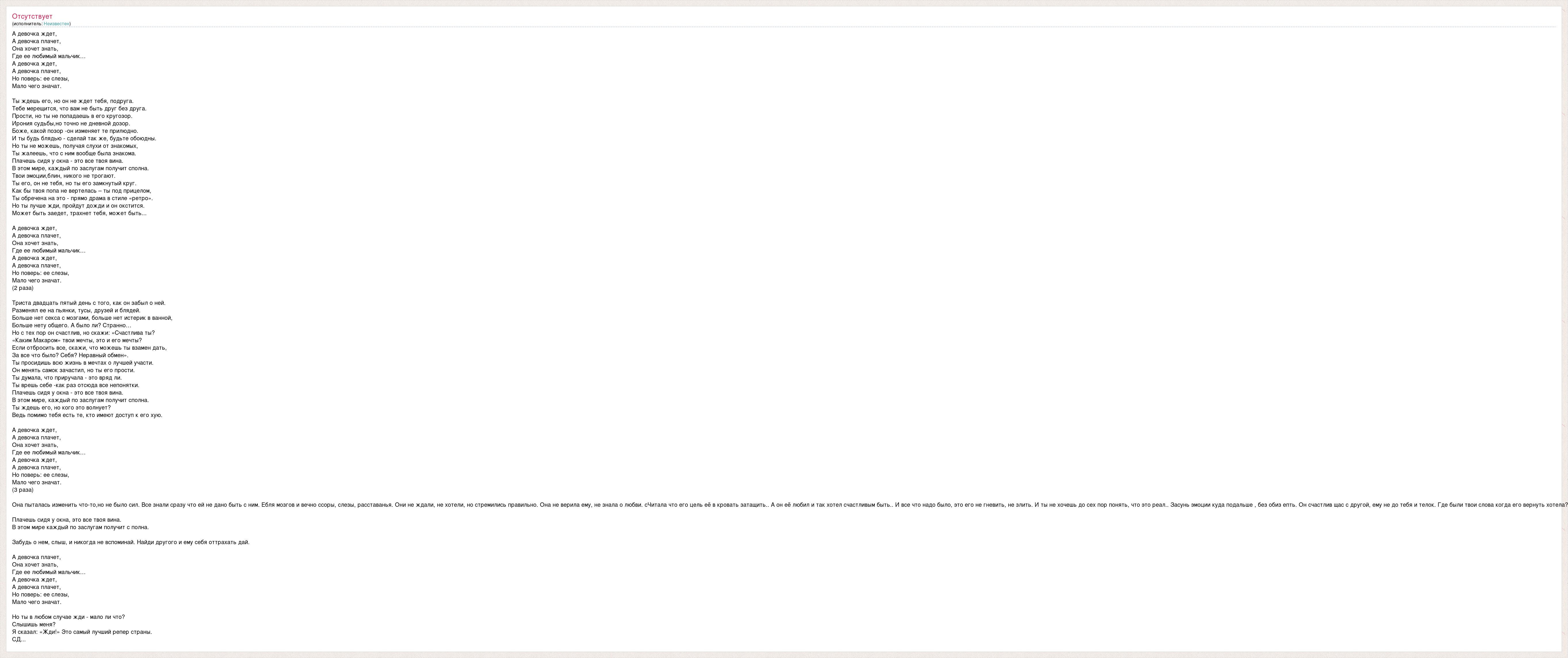 А девочка ждет, А девочка плачет, Она хочет знать, Где ее любимый мальчик… А девочка ждет, А девочка плачет, Но поверь: ее слезы, Мало чего значат. Ты ждешь его, но он не ждет тебя, подруга. Тебе мерещится, что вам не быть друг без друга. Прости, но ты не попадаешь в его кругозор. Ирония судьбы,но точно не дневной дозор. Боже, какой позор -он изменяет те прилюдно. И ты будь блядью - сделай так же, будьте обоюдны. Но ты не можешь, получая слухи от знакомых, Ты жалеешь, что с ним вообще была знакома. Плачешь сидя у окна - это все твоя вина. В этом мире, каждый по заслугам получит сполна. Твои эмоции,блин, никого не трогают. Ты его, он не тебя, но ты его замкнутый круг. Как бы твоя попа не вертелась – ты под прицелом, Ты обречена на это - прямо драма в стиле «ретро». Но ты лучше жди, пройдут дожди и он окстится. Может быть заедет, трахнет тебя, может быть... А девочка ждет, А девочка плачет, Она хочет знать, Где ее любимый мальчик… А девочка ждет, А девочка плачет, Но поверь: ее слезы, Мало чего значат. (2 раза) Триста двадцать пятый день с того, как он забыл о ней. Разменял ее на пьянки, тусы, друзей и блядей. Больше нет секса с мозгами, больше нет истерик в ванной, Больше нету общего. А было ли? Странно… Но с тех пор он счастлив, но скажи: «Счастлива ты? «Каким Макаром» твои мечты, это и его мечты? Если отбросить все, скажи, что можешь ты взамен дать, За все что было? Себя? Неравный обмен». Ты просидишь всю жизнь в мечтах о лучшей участи. Он менять самок зачастил, но ты его прости. Ты думала, что приручала - это вряд ли. Ты врешь себе -как раз отсюда все непонятки. Плачешь сидя у окна - это все твоя вина. В этом мире, каждый по заслугам получит сполна. Ты ждешь его, но кого это волнует? Ведь помимо тебя есть те, кто имеют доступ к его хую. А девочка ждет, А девочка плачет, Она хочет знать, Где ее любимый мальчик… А девочка ждет, А девочка плачет, Но поверь: ее слезы, Мало чего значат. (3 раза) Она пыталась изменить что-то,но не было сил. Все знали сразу что ей не дано быть с ним. Ебля мозгов и вечно ссоры, слезы, расставанья. Они не ждали, не хотели, но стремились правильно. Она не верила ему, не знала о любви. сЧитала что его цель её в кровать затащить.. А он её любил и так хотел счастливым быть.. И все что надо было, это его не гневить, не злить. И ты не хочешь до сех пор понять, что это реал.. Засунь эмоции куда подальше , без обиз епть. Он счастлив щас с другой, ему не до тебя и телок. Где были твои слова когда его вернуть хотела? Плачешь сидя у окна, это все твоя вина. В этом мире каждый по заслугам получит с полна. Забудь о нем, слыш, и никогда не вспоминай. Найди другого и ему себя оттрахать дай. А девочка плачет, Она хочет знать, Где ее любимый мальчик… А девочка ждет, А девочка плачет, Но поверь: ее слезы, Мало чего значат. Но ты в любом случае жди - мало ли что? Слышишь меня? Я сказал: «Жди!» Это самый лучший репер страны. СД...