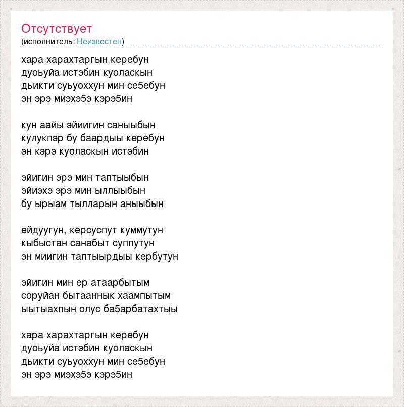 хара харахтаргын керебун дуоьуйа истэбин куоласкын дьикти суьуоххун мин се5ебун эн эрэ миэхэ5э кэрэ5ин кун аайы эйиигин саныыбын кулукпэр бу баардыы керебун эн кэрэ куоласкын истэбин эйигин эрэ мин таптыыбын эйиэхэ эрэ мин ыллыыбын бу ырыам тылларын аныыбын ейдуугун, керсуспут куммутун кыбыстан санабыт суппутун эн миигин таптыырдыы кербутун эйигин мин ер атаарбытым соруйан бытааннык хаампытым ыытыахпын олус ба5арбатахтыы хара харахтаргын керебун дуоьуйа истэбин куоласкын дьикти суьуоххун мин се5ебун эн эрэ миэхэ5э кэрэ5ин