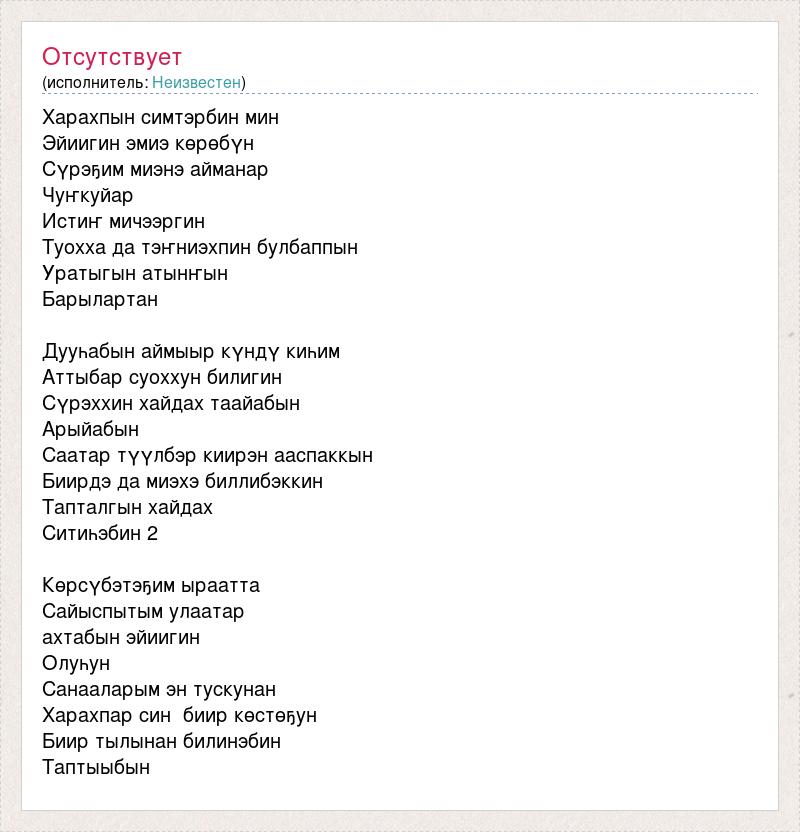 Харахпын симтэрбин мин Эйиигин эмиэ көрөбүн Сүрэҕим миэнэ айманар Чуҥкуйар Истиҥ мичээргин Туохха да тэҥниэхпин булбаппын Уратыгын атынҥын Барылартан Дууһабын аймыыр күндү киһим Аттыбар суоххун билигин Сүрэххин хайдах таайабын Арыйабын Саатар түүлбэр киирэн ааспаккын Биирдэ да миэхэ биллибэккин Тапталгын хайдах Ситиһэбин 2 Көрсүбэтэҕим ыраатта Сайыспытым улаатар ахтабын эйиигин Олуһун Санааларым эн тускунан Харахпар син биир көстөҕун Биир тылынан билинэбин Таптыыбын