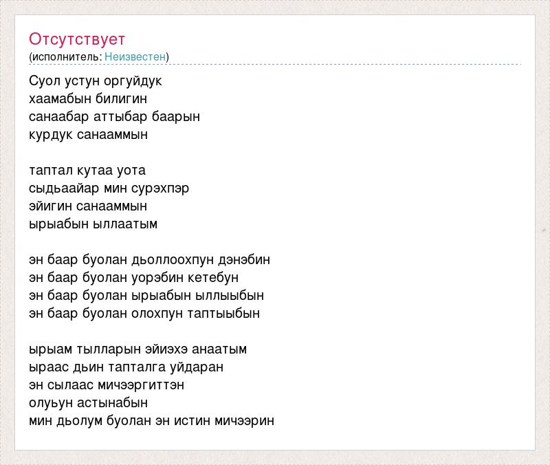 Cуол устун оргуйдук хаамабын билигин санаабар аттыбар баарын курдук санааммын таптал кутаа уота сыдьаайар мин сурэхпэр эйигин санааммын ырыабын ыллаатым эн баар буолан дьоллоохпун дэнэбин эн баар буолан уорэбин кетебун эн баар буолан ырыабын ыллыыбын эн баар буолан олохпун таптыыбын ырыам тылларын эйиэхэ анаатым ыраас дьин тапталга уйдаран эн сылаас мичээргиттэн олуьун астынабын мин дьолум буолан эн истин мичээрин