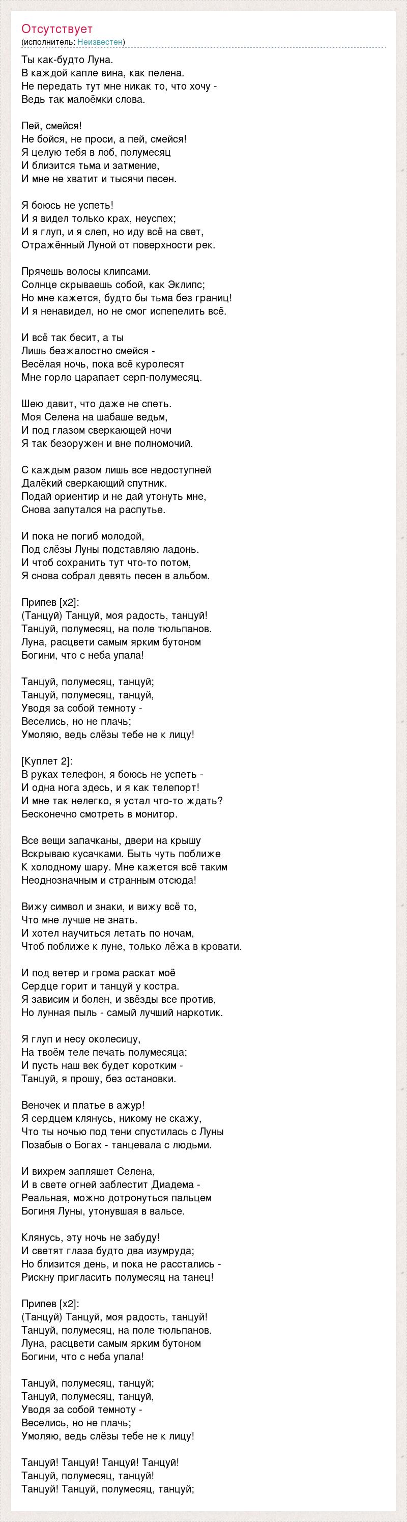 Ты как-будто Луна. В каждой капле вина, как пелена. Не передать тут мне никак то, что хочу - Ведь так малоёмки слова. Пей, смейся! Не бойся, не проси, а пей, смейся! Я целую тебя в лоб, полумесяц И близится тьма и затмение, И мне не хватит и тысячи песен. Я боюсь не успеть! И я видел только крах, неуспех; И я глуп, и я слеп, но иду всё на свет, Отражённый Луной от поверхности рек. Прячешь волосы клипсами. Солнце скрываешь собой, как Эклипс; Но мне кажется, будто бы тьма без границ! И я ненавидел, но не смог испепелить всё. И всё так бесит, а ты Лишь безжалостно смейся - Весёлая ночь, пока всё куролесят Мне горло царапает серп-полумесяц. Шею давит, что даже не спеть. Моя Селена на шабаше ведьм, И под глазом сверкающей ночи Я так безоружен и вне полномочий. С каждым разом лишь все недоступней Далёкий сверкающий спутник. Подай ориентир и не дай утонуть мне, Снова запутался на распутье. И пока не погиб молодой, Под слёзы Луны подставляю ладонь. И чтоб сохранить тут что-то потом, Я снова собрал девять песен в альбом. Припев [x2]: (Танцуй) Танцуй, моя радость, танцуй! Танцуй, полумесяц, на поле тюльпанов. Луна, расцвети самым ярким бутоном Богини, что с неба упала! Танцуй, полумесяц, танцуй; Танцуй, полумесяц, танцуй, Уводя за собой темноту - Веселись, но не плачь; Умоляю, ведь слёзы тебе не к лицу! [Куплет 2]: В руках телефон, я боюсь не успеть - И одна нога здесь, и я как телепорт! И мне так нелегко, я устал что-то ждать? Бесконечно смотреть в монитор. Все вещи запачканы, двери на крышу Вскрываю кусачками. Быть чуть поближе К холодному шару. Мне кажется всё таким Неоднозначным и странным отсюда! Вижу символ и знаки, и вижу всё то, Что мне лучше не знать. И хотел научиться летать по ночам, Чтоб поближе к луне, только лёжа в кровати. И под ветер и грома раскат моё Сердце горит и танцуй у костра. Я зависим и болен, и звёзды все против, Но лунная пыль - самый лучший наркотик. Я глуп и несу околесицу, На твоём теле печать полумесяца; И пусть наш век будет коротким - Танцуй, я прошу, без остановки. Веночек и платье в ажур! Я сердцем клянусь, никому не скажу, Что ты ночью под тени спустилась с Луны Позабыв о Богах - танцевала с людьми. И вихрем запляшет Селена, И в свете огней заблестит Диадема - Реальная, можно дотронуться пальцем Богиня Луны, утонувшая в вальсе. Клянусь, эту ночь не забуду! И светят глаза будто два изумруда; Но близится день, и пока не расстались - Рискну пригласить полумесяц на танец! Припев [x2]: (Танцуй) Танцуй, моя радость, танцуй! Танцуй, полумесяц, на поле тюльпанов. Луна, расцвети самым ярким бутоном Богини, что с неба упала! Танцуй, полумесяц, танцуй; Танцуй, полумесяц, танцуй, Уводя за собой темноту - Веселись, но не плачь; Умоляю, ведь слёзы тебе не к лицу! Танцуй! Танцуй! Танцуй! Танцуй! Танцуй, полумесяц, танцуй! Танцуй! Танцуй, полумесяц, танцуй;