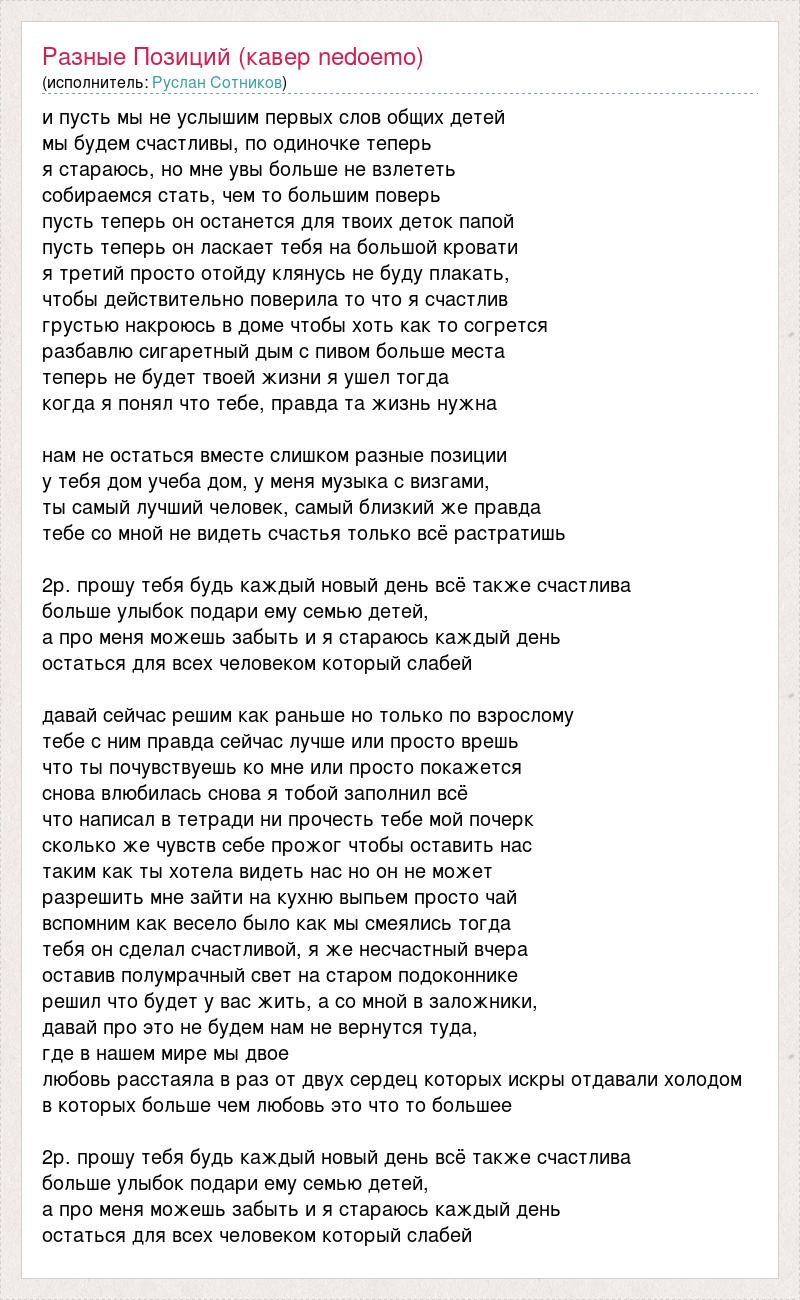и пусть мы не услышим первых слов общих детей мы будем счастливы, по одиночке теперь я стараюсь, но мне увы больше не взлететь собираемся стать, чем то большим поверь пусть теперь он останется для твоих деток папой пусть теперь он ласкает тебя на большой кровати я третий просто отойду клянусь не буду плакать, чтобы действительно поверила то что я счастлив грустью накроюсь в доме чтобы хоть как то согрется разбавлю сигаретный дым с пивом больше места теперь не будет твоей жизни я ушел тогда когда я понял что тебе, правда та жизнь нужна нам не остаться вместе слишком разные позиции у тебя дом учеба дом, у меня музыка с визгами, ты самый лучший человек, самый близкий же правда тебе со мной не видеть счастья только всё растратишь 2р. прошу тебя будь каждый новый день всё также счастлива больше улыбок подари ему семью детей, а про меня можешь забыть и я стараюсь каждый день остаться для всех человеком который слабей давай сейчас решим как раньше но только по взрослому тебе с ним правда сейчас лучше или просто врешь что ты почувствуешь ко мне или просто покажется снова влюбилась снова я тобой заполнил всё что написал в тетради ни прочесть тебе мой почерк сколько же чувств себе прожог чтобы оставить нас таким как ты хотела видеть нас но он не может разрешить мне зайти на кухню выпьем просто чай вспомним как весело было как мы смеялись тогда тебя он сделал счастливой, я же несчастный вчера оставив полумрачный свет на старом подоконнике решил что будет у вас жить, а со мной в заложники, давай про это не будем нам не вернутся туда, где в нашем мире мы двое любовь расстаяла в раз от двух сердец которых искры отдавали холодом в которых больше чем любовь это что то большее 2р. прошу тебя будь каждый новый день всё также счастлива больше улыбок подари ему семью детей, а про меня можешь забыть и я стараюсь каждый день остаться для всех человеком который слабей