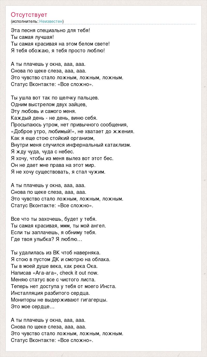 Эта песня специально для тебя! Ты самая лучшая! Ты самая красивая на этом белом свете! Я тебя обожаю, я тебя просто люблю! А ты плачешь у окна, ааа, ааа. Снова по щеке слеза, ааа, ааа. Это чувство стало ложным, ложным, ложным. Статус Вконтакте: «Все сложно». Ты ушла вот так по щелчку пальцев. Одним выстрелом двух зайцев, Эту любовь и самого меня. Каждый день - не день, виню себя. Просыпаюсь утром, нет привычного сообщения, «Доброе утро, любимый!», не хватает до жжения. Как я еще стою стойкий организм, Внутри меня случился инфернальный катаклизм. Я жду чуда, чуда с небес. Я хочу, чтобы из меня вылез вот этот бес. Он не дает мне права на этот мир. Я не хочу существовать, я стал чужим. А ты плачешь у окна, ааа, ааа. Снова по щеке слеза, ааа, ааа. Это чувство стало ложным, ложным, ложным. Статус Вконтакте: «Все сложно». Все что ты захочешь, будет у тебя. Ты самая красивая, ммм, ты мой ангел. Если ты заплачешь, я обниму тебя. Где твоя улыбка? Я люблю… Ты удалилась из ВК чтоб наверняка. Я стою в пустом ДК и смотрю на облака. Ты в моей душе века, как река Ока. Написав «Ага-ага», check it out now. Меняю статус все с чистого листа. Теперь нет доступа у тебя от моего Инста. Инсталляция разбитого сердца. Мониторы не выдерживают гигагерцы. Это мое сердце… А ты плачешь у окна, ааа, ааа. Снова по щеке слеза, ааа, ааа. Это чувство стало ложным, ложным, ложным. Статус Вконтакте: «Все сложно».